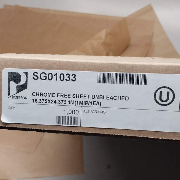 PATERSON 1,000 PACK! Unbleached Chromium-Free Reusable Baking Parchment Paper Sheets Condition: New Size: 16.375" x 24.375" Quantity: 1 Box of 1,000 Sheets Color: Brown MPN / Model: SG01033 BAKING LINERS - Chrome Free Pan Liners for Commercial Baking. Ideal for bakeries, cafes, and restaurants. Paterson Pan Liners feature a hard, pinhole-free surface. Perfect for temperatures up to 425 degrees Fahrenheit. Handles 1-2 bake cycles per sheet. COMMERCIAL QUANTITY - Restock your supplies with our cost-effective case pack of 1000 pan liners. Industry standard quality and convenient bulk delivery at an affordable price. FULL-SIZE PANS - Each pre-cut commercial pan liner measures 16.38” x 24.38” for added convenience. Made to cover a full-size pan. Use our stick-resistant surface baking liners to preserve sheet and bun pans. Ideal for baking cookies, pastries, desserts, entrees, snacks, and more. CHROME FREE - Grease resistant paper is all natural, biodegradable and chromium free. Our liners help prevent the build-up of browning and stains on pans, sheets, and trays to ensure longer lasting equipment. Quick and easy disposal. Grease goes into the trash, not down the drain. SINCE 1923 - Paterson Paper specializes in printing and converting paper products. We provide products to the restaurant, hospitality and baking industries. Our products include printed and plain napkins, placemats, coasters, roll stock, baking cups and baking sheets. Always made in the USA.