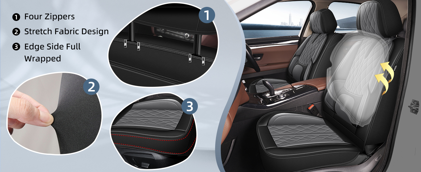 - 【Well Made】 The automotive seat covers are made of high-quality materials with high-grade craftsmanship. Selected faux leather, high elastic sponge, heat-laminated non-woven fabric, non-slip base fabric, five-layer design. Better material quality, better design and manufacturing, bring you a better user experience.