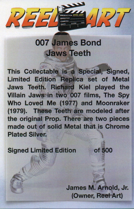 This Collectable is part of our Special "007 James Bond Prop Replica Collection." This is an Exclusive: Signed, Numbered, Limited Edition of Prop Replicas. This item is a Set of Jaws Metal Teeth as seen in: "Moonraker (1979)" and "The Spy Who Loved Me (1977)" Both Starring: Roger Moore as James Bond and Richard Kiel as "Jaws". This Movie Prop Replica is an Artists Rendering created from Pictures of the Real Prop that appears in several books and the films. Each item Comes Complete with a Double Sided, 4 x 6 inch, Full Color, Professionally Printed, Certification Card. This Documentation contains Poster Art and Explains in Detail about the Jaws Teeth and how it was used in the film. Each Set of Jaws Teeth come Brand New in a Velvet like Bag.