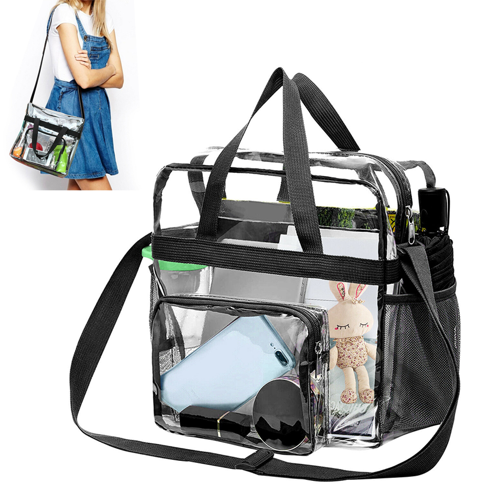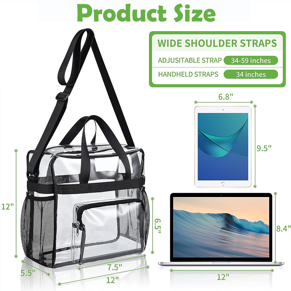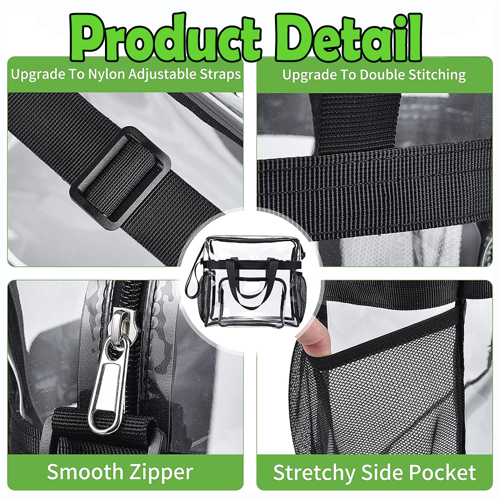 Large Size: Clear bag is 12*12*6in, one transparent front pocket, large enough to hold the camera, sunscreen, water bottle, wallet, mobile phone, sunglasses, etc. Two sides mesh pockets, store items quickly.