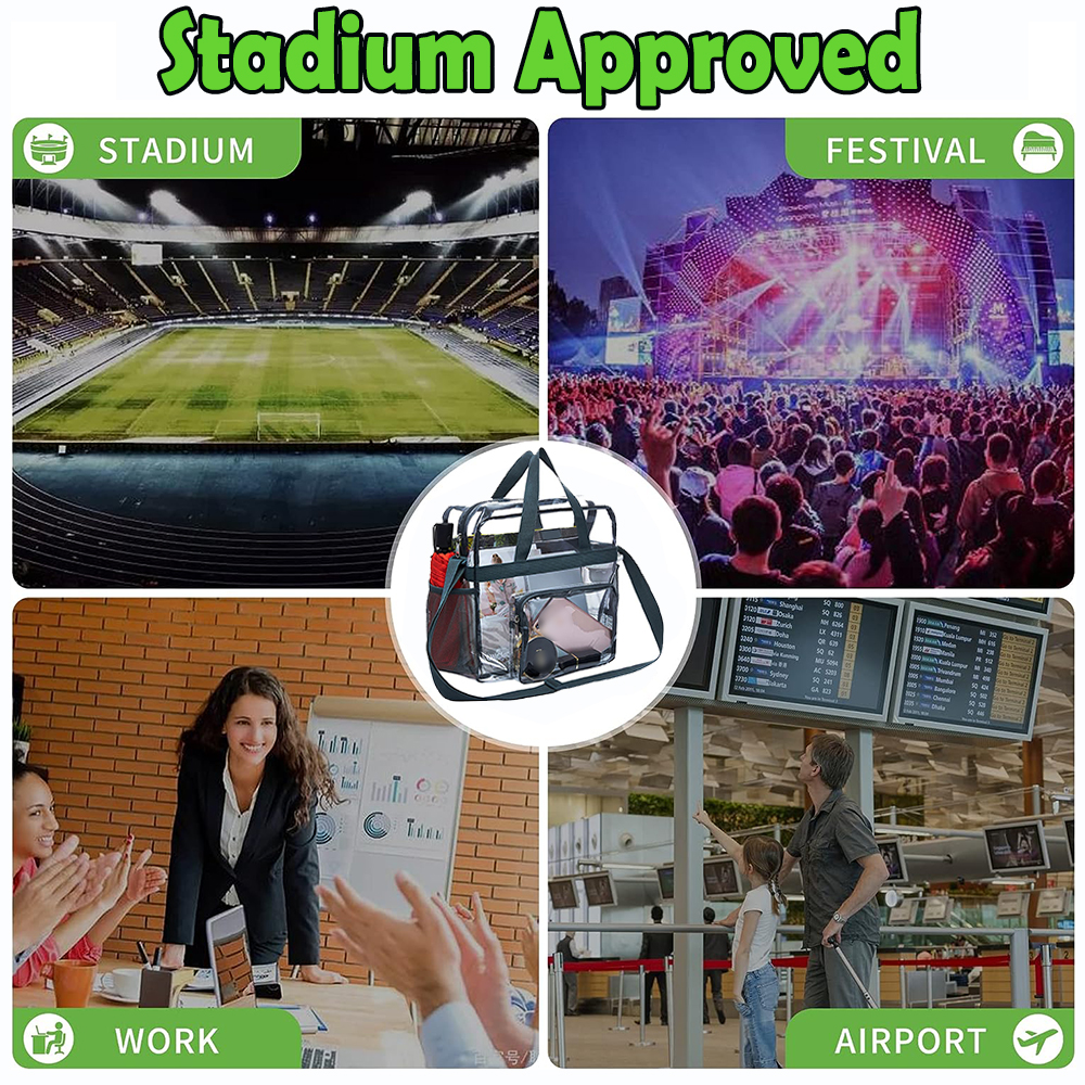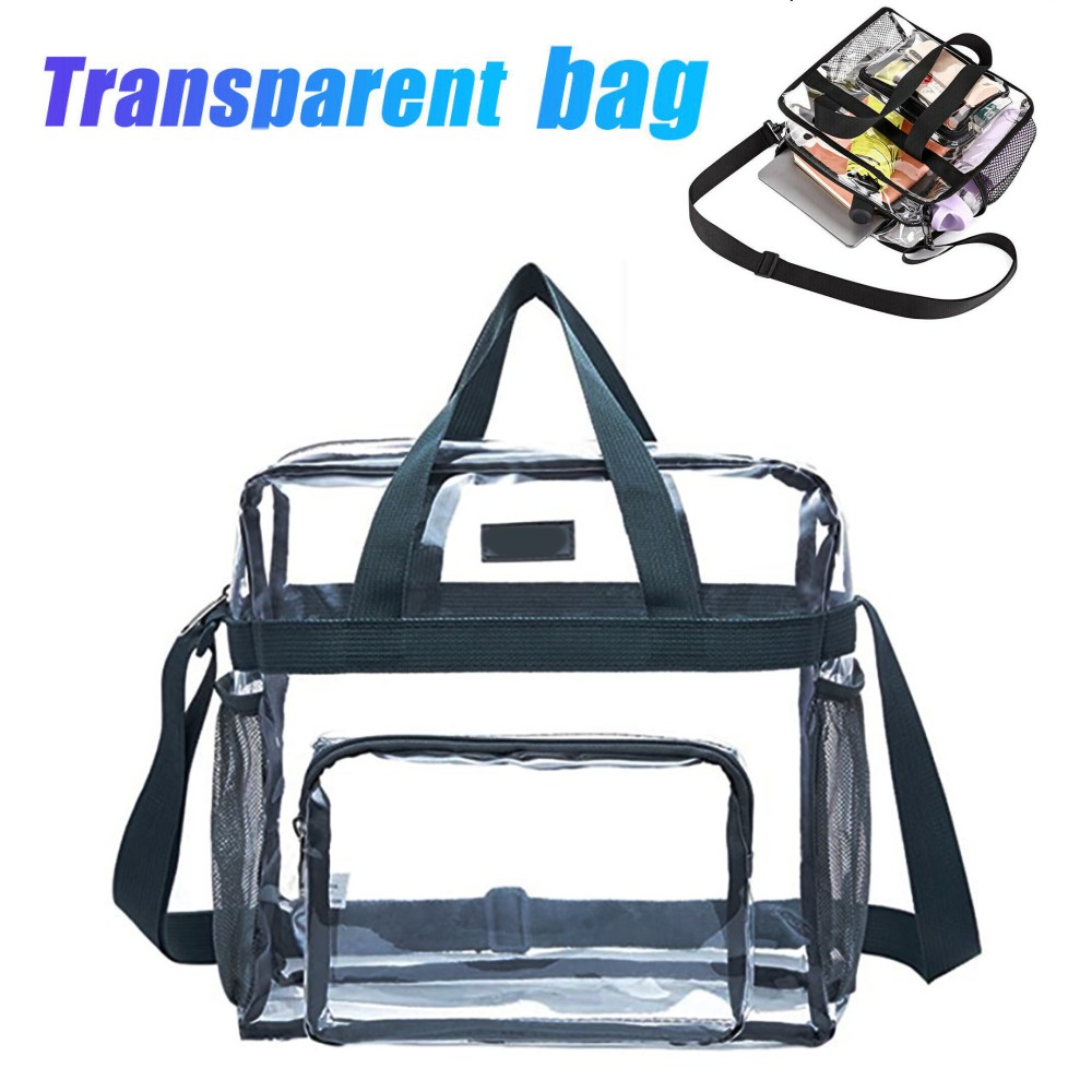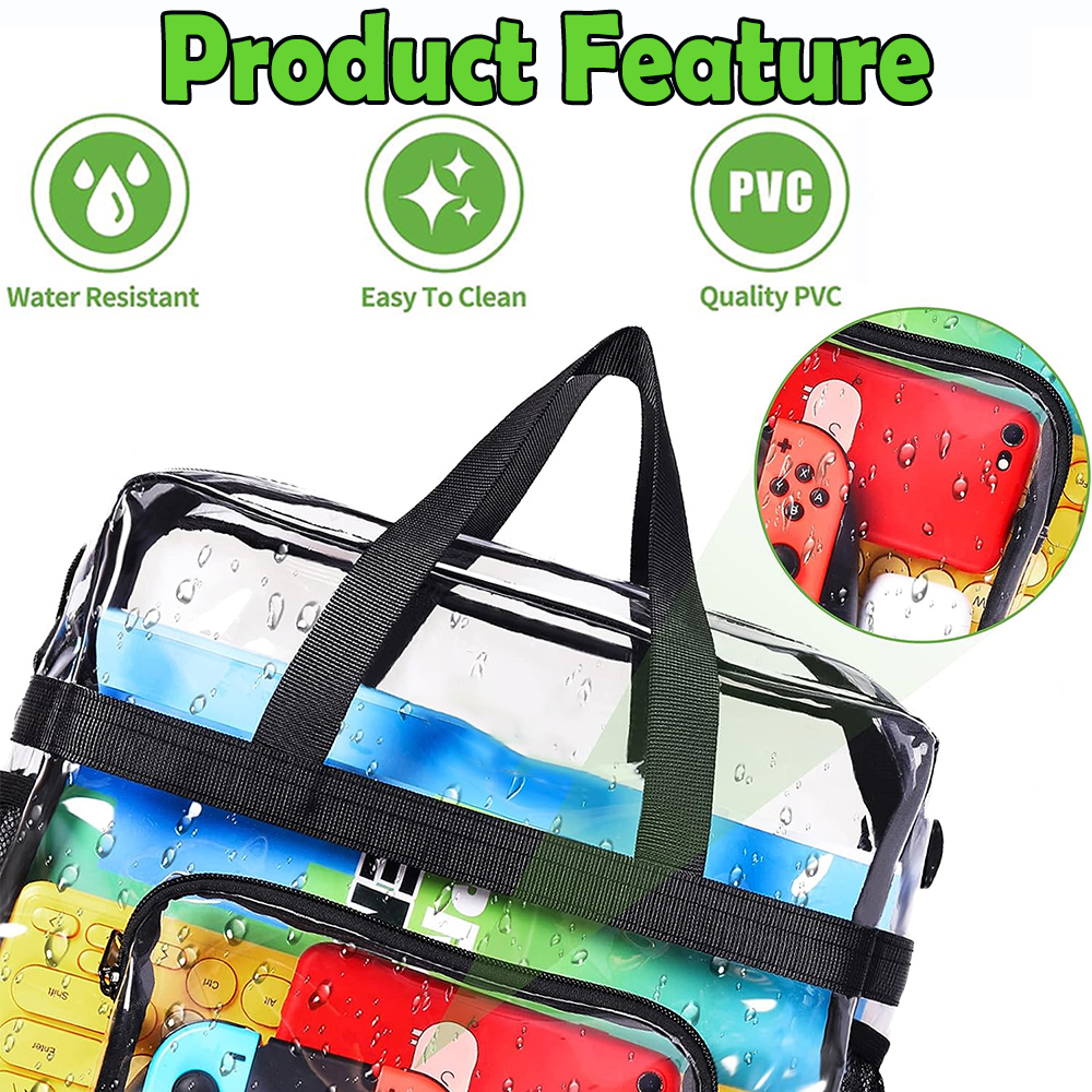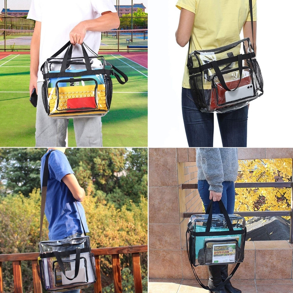 Large Size: Clear bag is 12*12*6in, one transparent front pocket, large enough to hold the camera, sunscreen, water bottle, wallet, mobile phone, sunglasses, etc. Two sides mesh pockets, store items quickly.