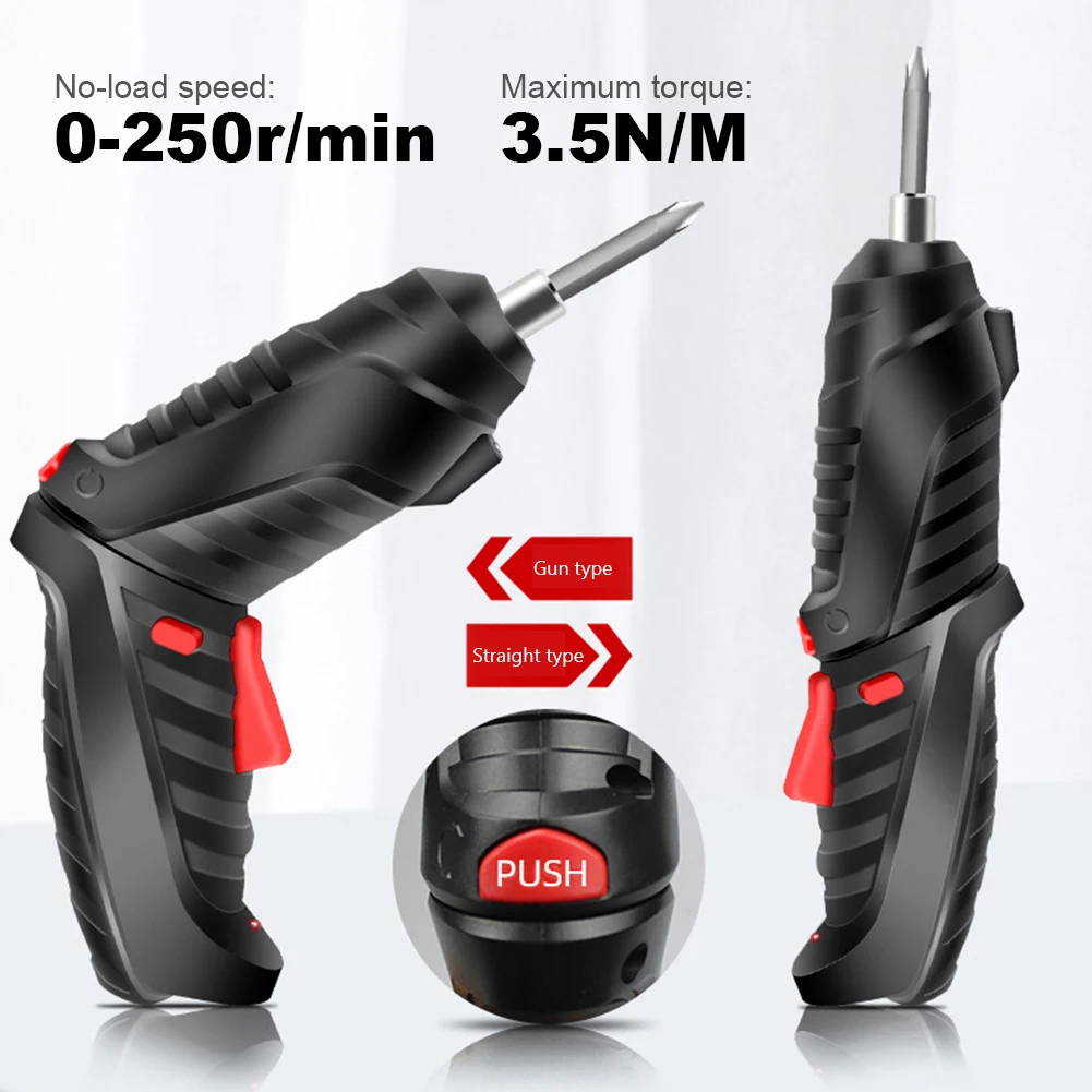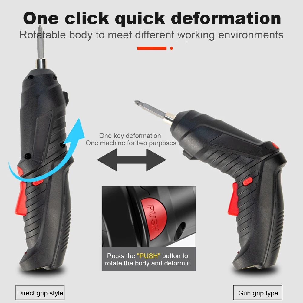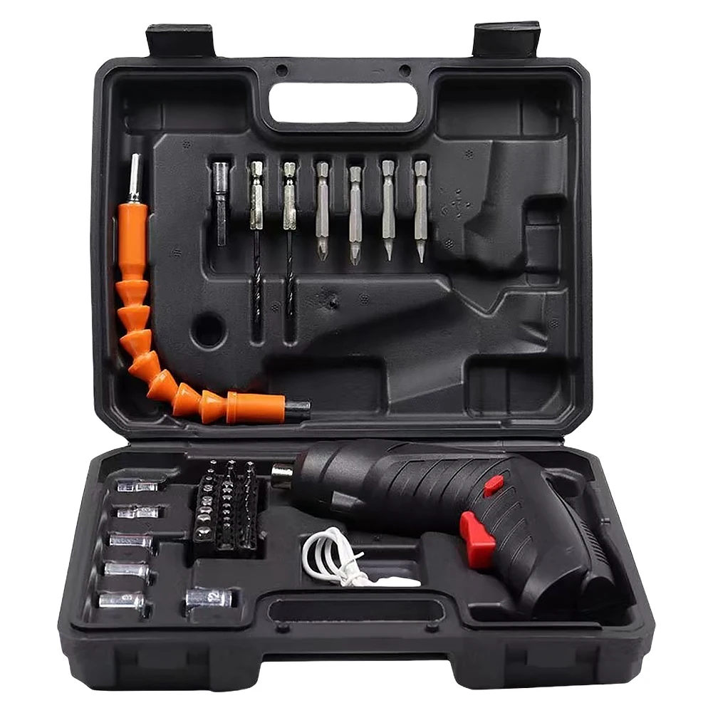 Feature: 1. Built-In LED Light:The household electric drill cordless screwdriver features a bright, front-mounted LED light that illuminates work areas during night or in dark conditions, enhancing precision and safety while driving screws. 2. Adjustable Handle Design:With a comfortable grip and ergonomic design, the powerful impact wireless screwdriver drill offers a dual-position handle that can be adjusted for ease of use, creating a more comfortable and efficient working environment. 3. Versatile 3-in-1 Tool:This electric screwdriver set includes a drill, an impact driver, and an LED light, all in one compact device. It offers ample power and adjustable torque settings, making it robust and easy to use for household tasks or light-duty projects. 4. USB Charging Capability:The portable screwdriver comes with a built-in 4V high-efficiency battery that can be charged via a USB port, ensuring it's ready to use in just 2-3 hours. This feature makes the screwdriver perfect for home or garden installations and disassemblies. 5. Superior Torque and Quality Bits:The electric power screwdriver set is equipped with a magnetic screwdriver bit holder and includes numerous high-quality bits, providing excellent torque and versatility for all your drilling and driving needs. This ensures you have the right tool for any job, big or small. Specification: Origin: Mainland China Type: Screwdriver Set Power Source: Battery Power supply: USB charging, with charging cable Battery capacity: 1800mah No-load speed: 0-250r/min Maximum torque: 3.5N/M Shell material: ABS Voltage: 3.6V Straight size: 210*40mm Gun size: 170*155*100mm Net weight: 310g Suitable for: furniture installation, carpentry drilling, electrical appliance repair, small dead space, etc. Accessories: One-piece batch: 2 pieces Cross bits: 2 pieces One-word short batch: 6 pieces Cross short batch: 8 pieces Four-corner short bits: 5 pieces Hexagonal short bits: 5 pieces Pattern short batch: 6 pieces Hexagonal handle connecting rod short rod: 1 piece Hexagonal handle connecting rod extension rod: 1 piece Universal flexible shaft: 1 Inner hex socket: 8 pcs Note: