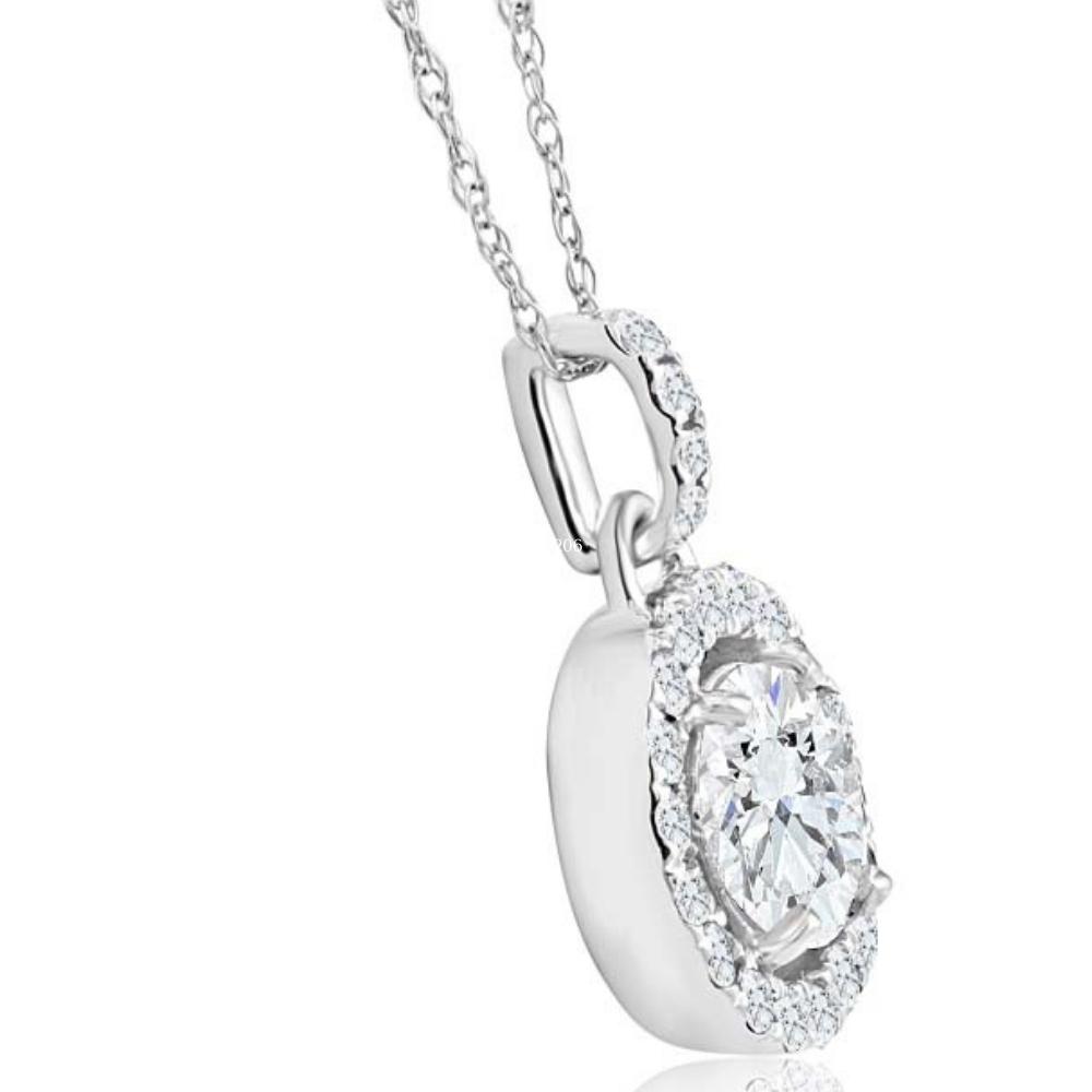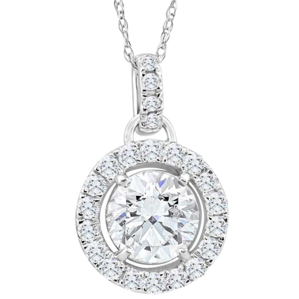 This women's pendant features a 1ct round cut lab grown center diamond and 22 accent natural diamonds set in solid 10k white gold with 10k white gold 18" spring ring chain.
