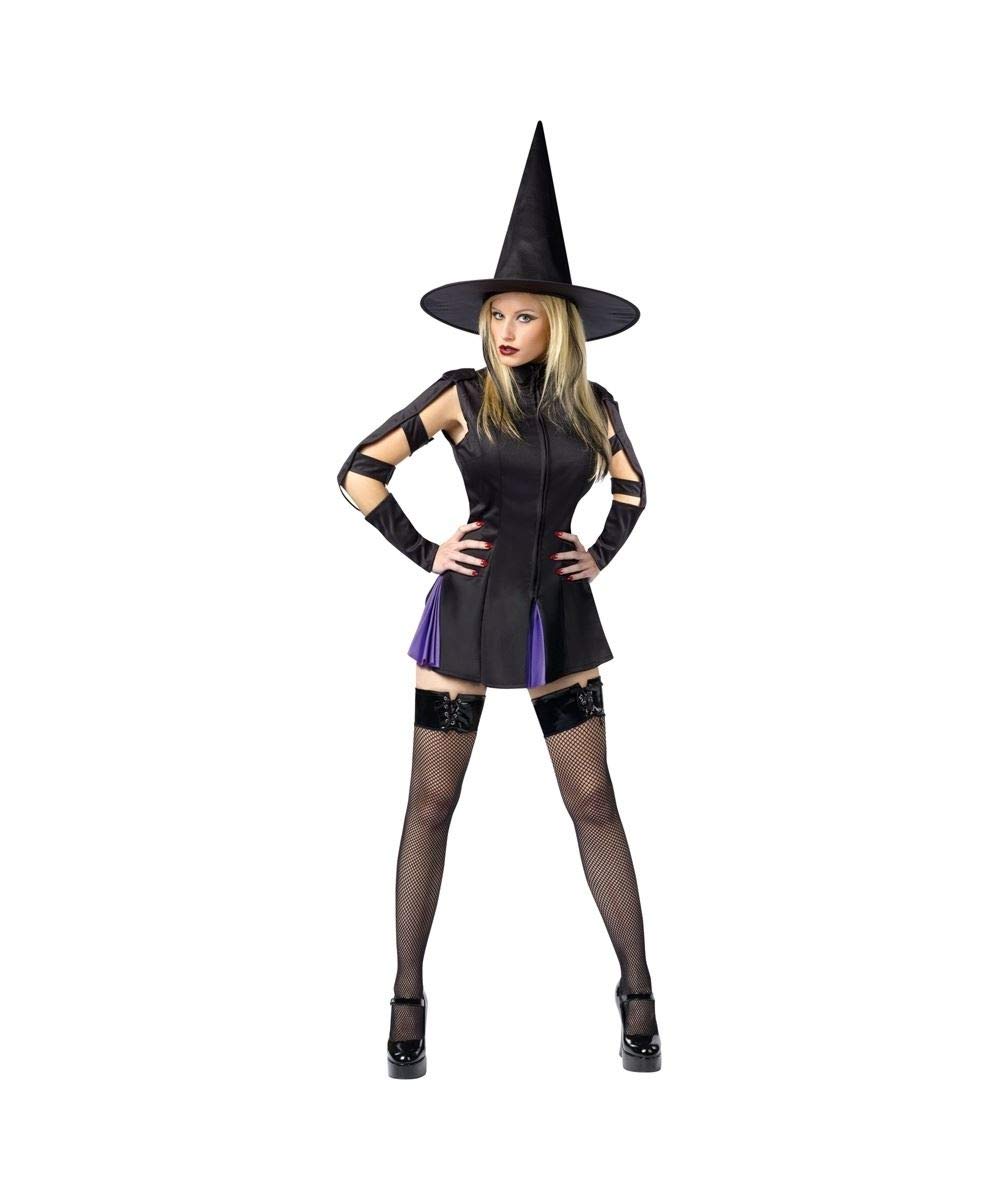 Enchant the night with the Spell "Binding" Witch Fantasy Costume by Fun World! Perfect for womens sizes M/L (dress size 10-14), this bewitching outfit features a sleek black mini dress with a zipper front for easy wear and a touch of modern flair. The dress is adorned with playful purple kick pleats that add a pop of color to your every move, while the cut-out sleeves give it a unique, edgy look. Complete with a classic witch hat, this costume is ideal for casting spells and turning heads at Halloween parties. Get ready to charm everyone with your spellbinding style!