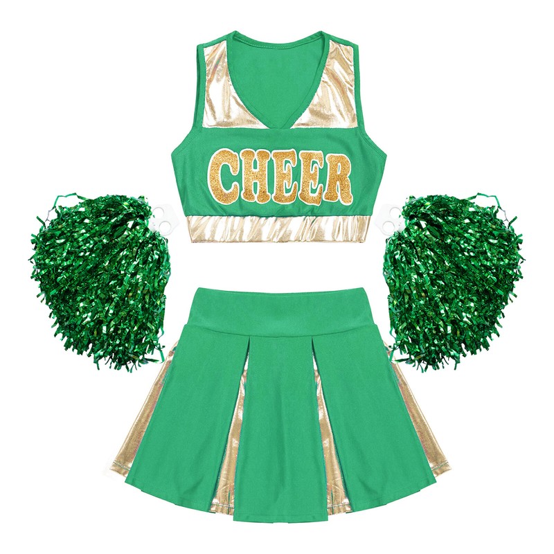 Sleeveless, v neckline crop top, CHEER printed in the front. Elastic waistband patchwork skirt, pleated style.
