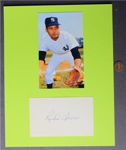 Check it out...Here's an UNCOMMON 8 1/2" wide by 11" tall AUTOGRAPH & photo of 1966-68 New York Yankees star Ruben Amaro (Died in 2017)-The page features a VINTAGE blue ink signature on an unlined 3x5 card that is tipped to a larger blue backer with a photo of Amaro on front- (See photos for clarification)-Great item.