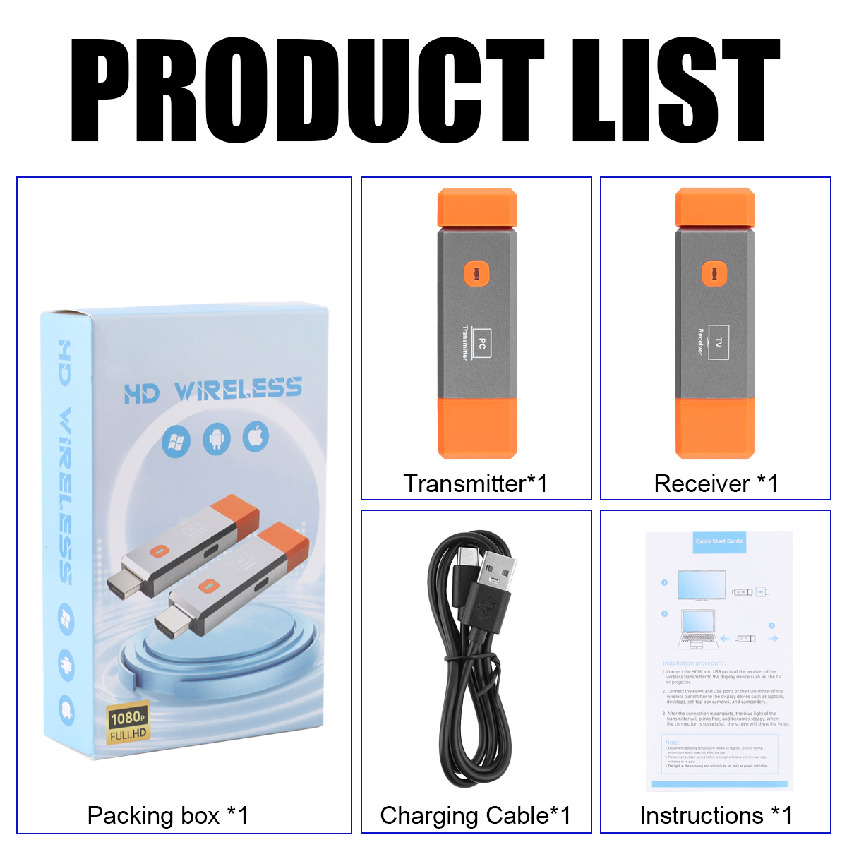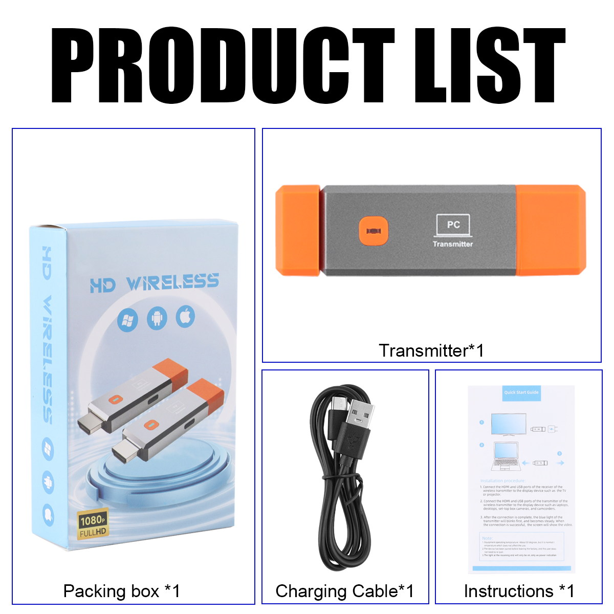 (4) Simple to use: just connect the transmitter HDMI to the transmitting device, the receiver connects to the display receiving end and plugs in the USB power supply to automatically cast the screen, no need to manually match; no network support required;