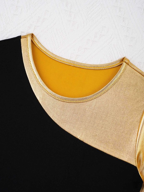 The dress features with long sleeves and patchwork with gold cloth, regular round neckline, cross pattern print in the front.