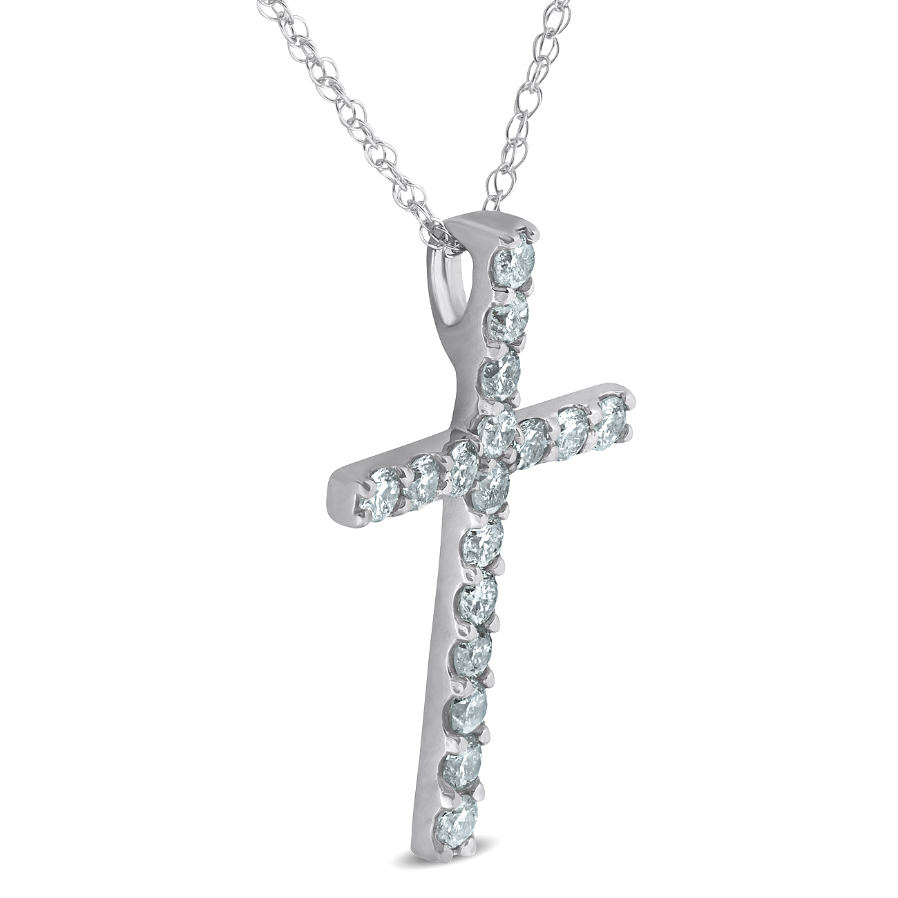 This classic cross pendant features 17 round brilliant cut natural diamonds. All diamonds are prong set in 14k white gold. An 18" 14k white gold clasp lock chain is included. Pendant is 1 1/4 inch tall.