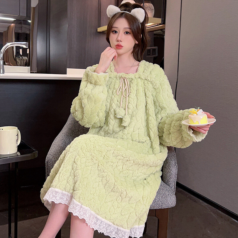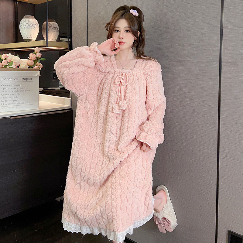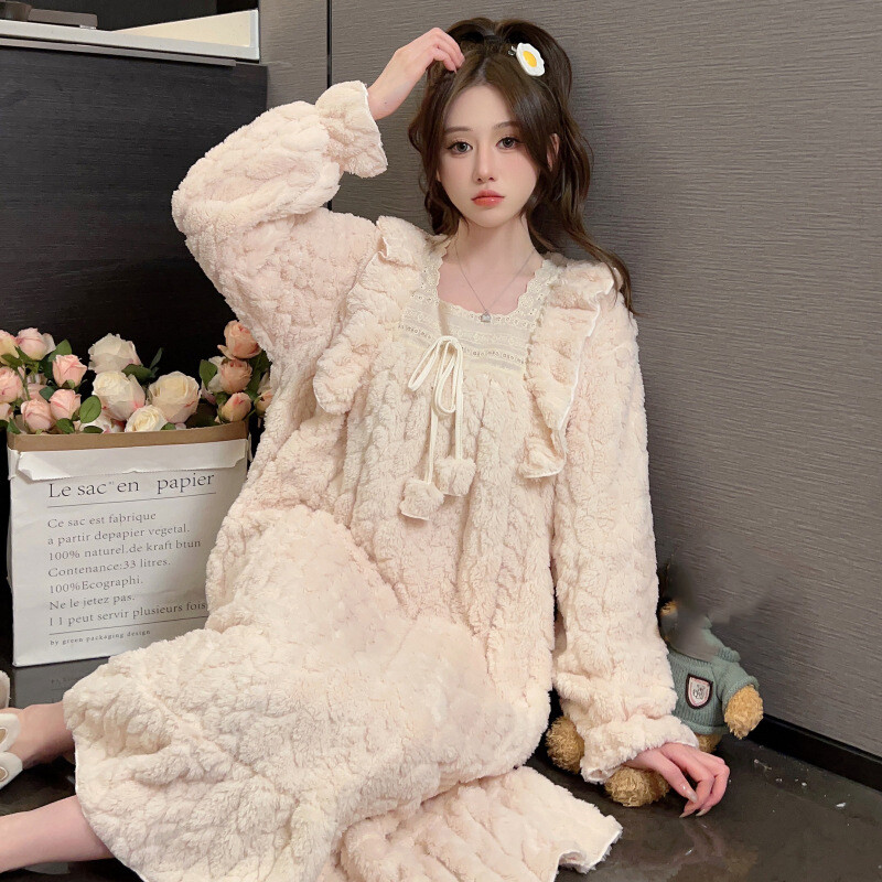 Winter Women's Flannel Nightgown Fluffy Coral Velvet Nightwear Lace Warm Pajamas