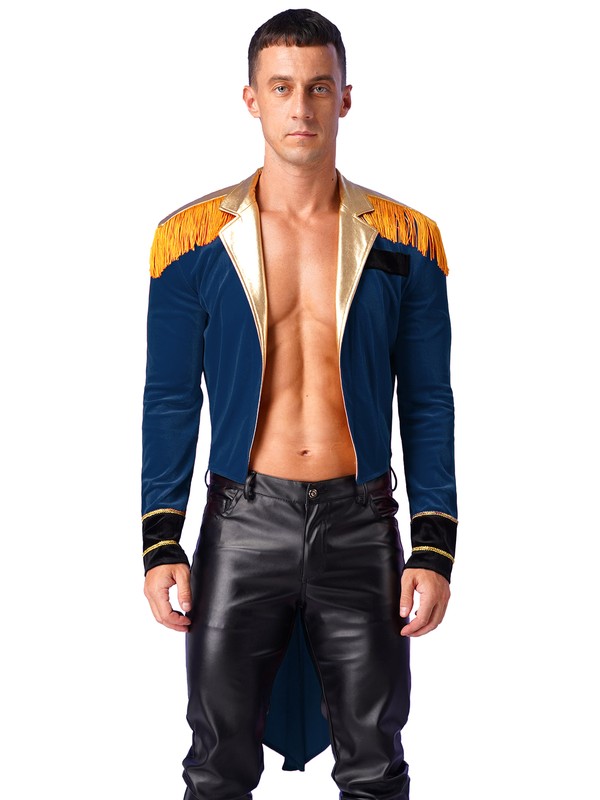 Long sleeve, lapel jacket is designed with fringed shoulder, tailcoat style.