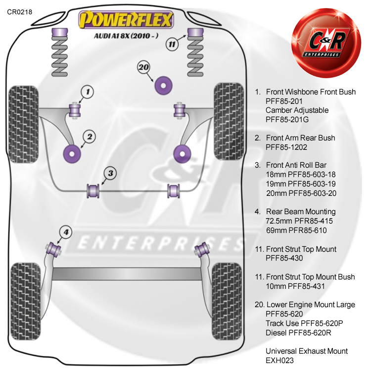 Diese Auflistung gilt für 2 Powerflex-Anti-Roll-Rollbüsche 18 mm mit der Teilenummer: PFF85-603-18