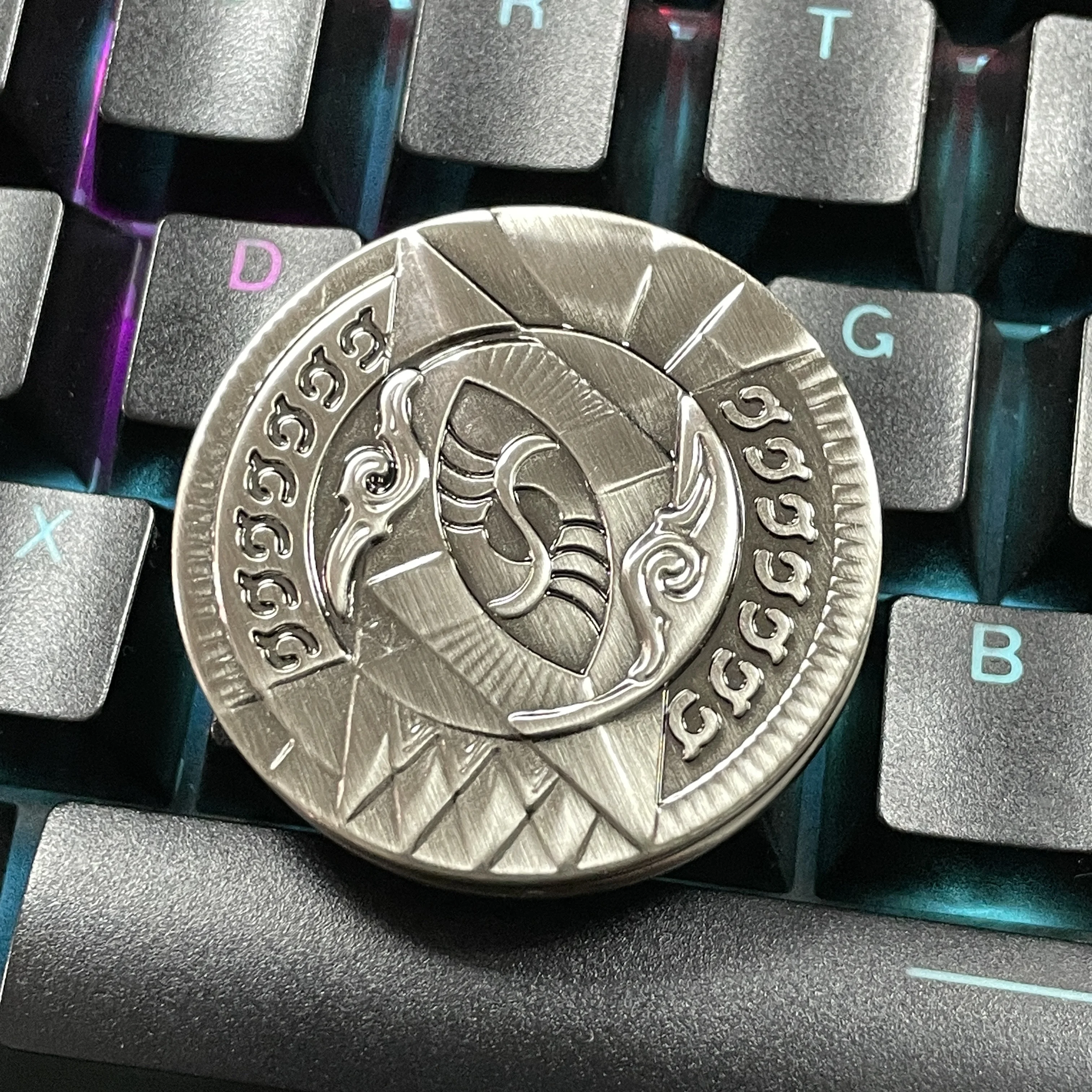 The fidget coin can be pushed clockwise or counterclockwise. When you push this fidget coin, the internal magnets snap into each other, giving you force feedback from the magnetic force. This process produces a very crisp metallic crashing sound.