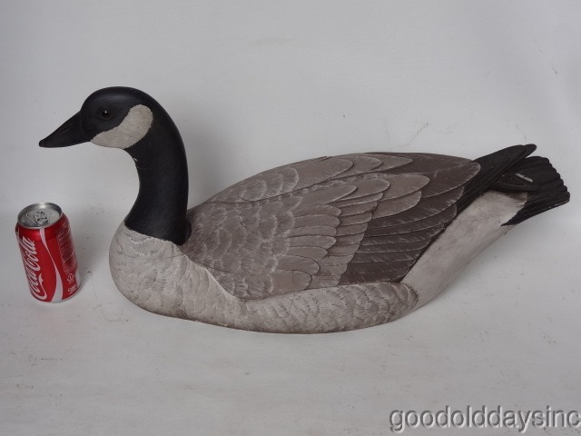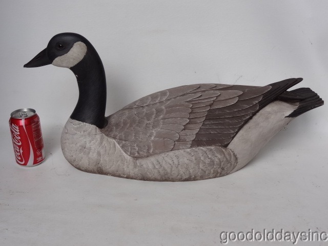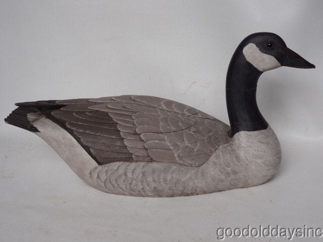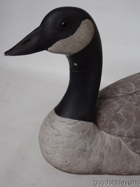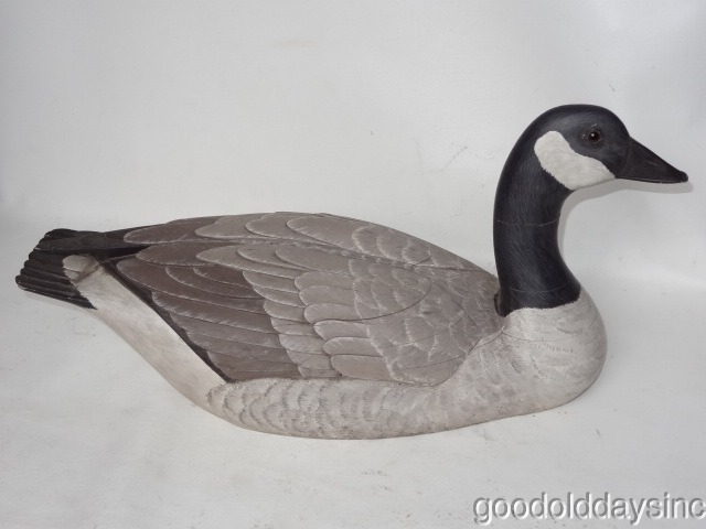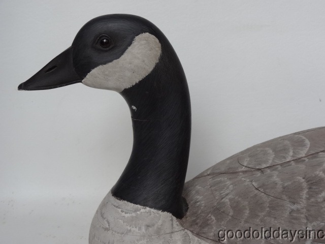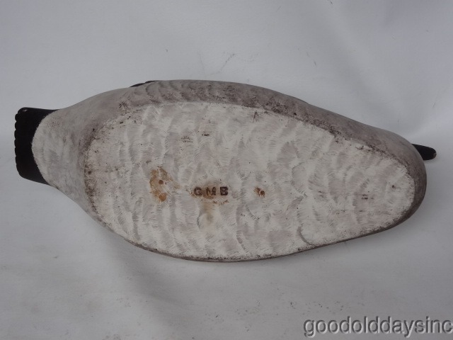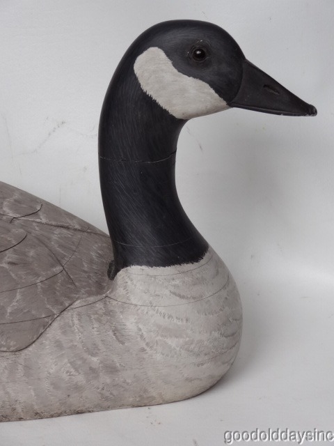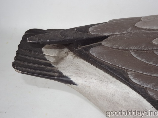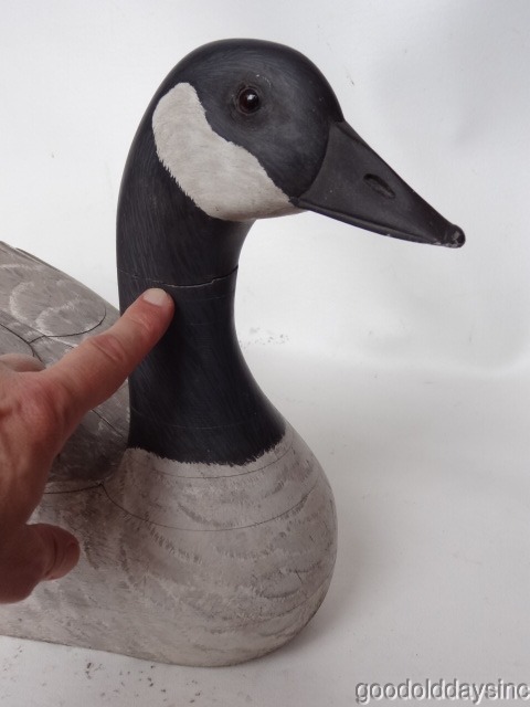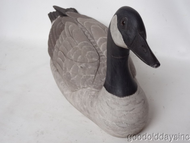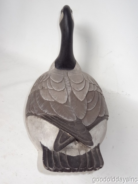 Here we have a beautiful vintage carved wood goose decoy. It is intricately carved and has the makers initials (GMB) on the underside. It measures 24.5" long x 8.5" wide x 12" tall. I notice it has a crack at the front of the neck (see picture). Please scroll down to view all 12 pictures and feel free to ask questions.