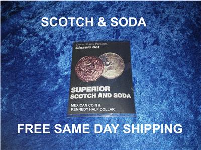If you don't have Scotch & Soda, you are missing out on the most versatile coin trick ever created. In one of many routines, you place a Kennedy Half Dollar and Mexican coin in your hand. Close and reopen your hand and the Mexican coin has vanished, only to be found in your pocket. No skill required. Includes Gimmicked Half Dollar Coin replica, Mexican Centavo replica Coin , Set includes extra Centavo Coin. New set with complete instructions