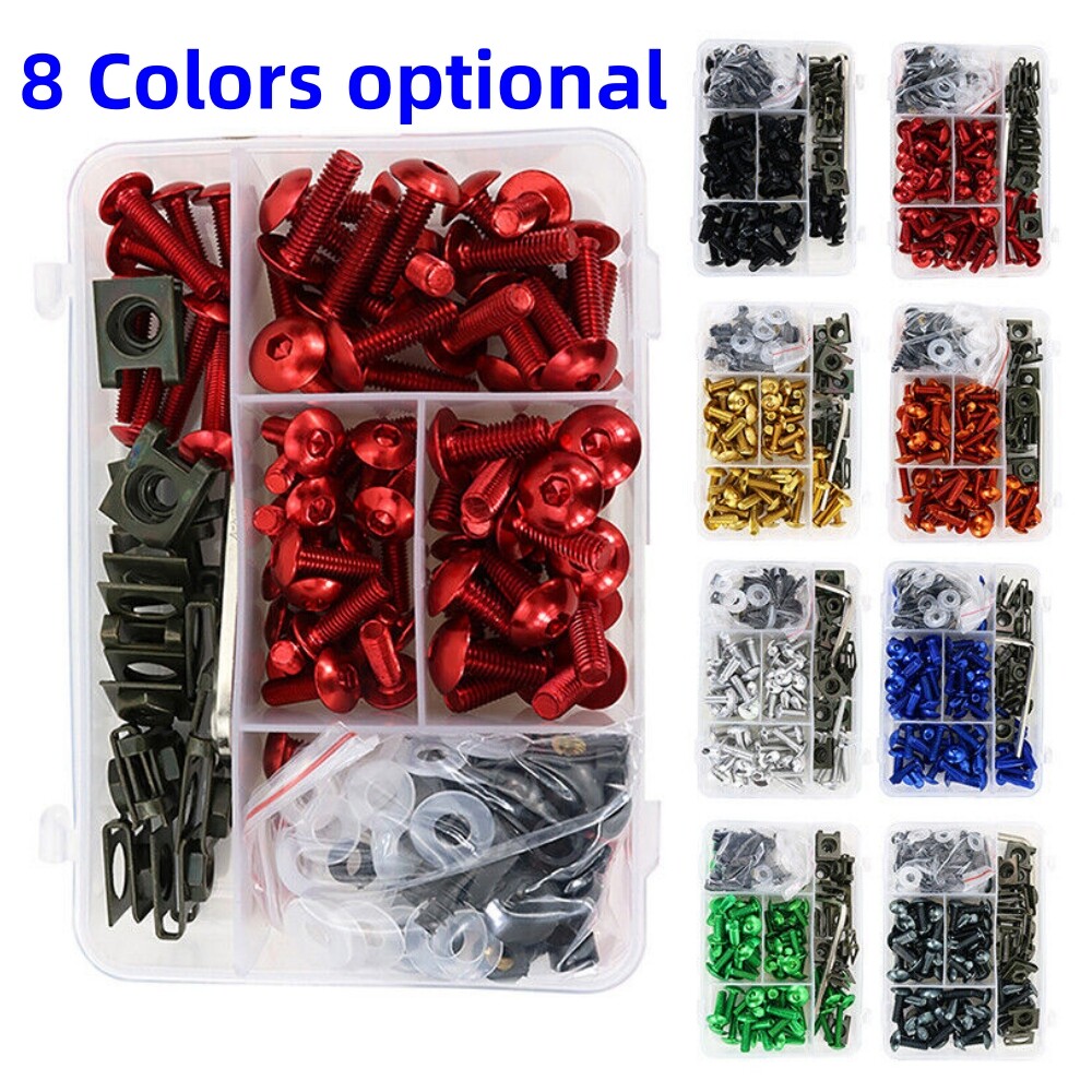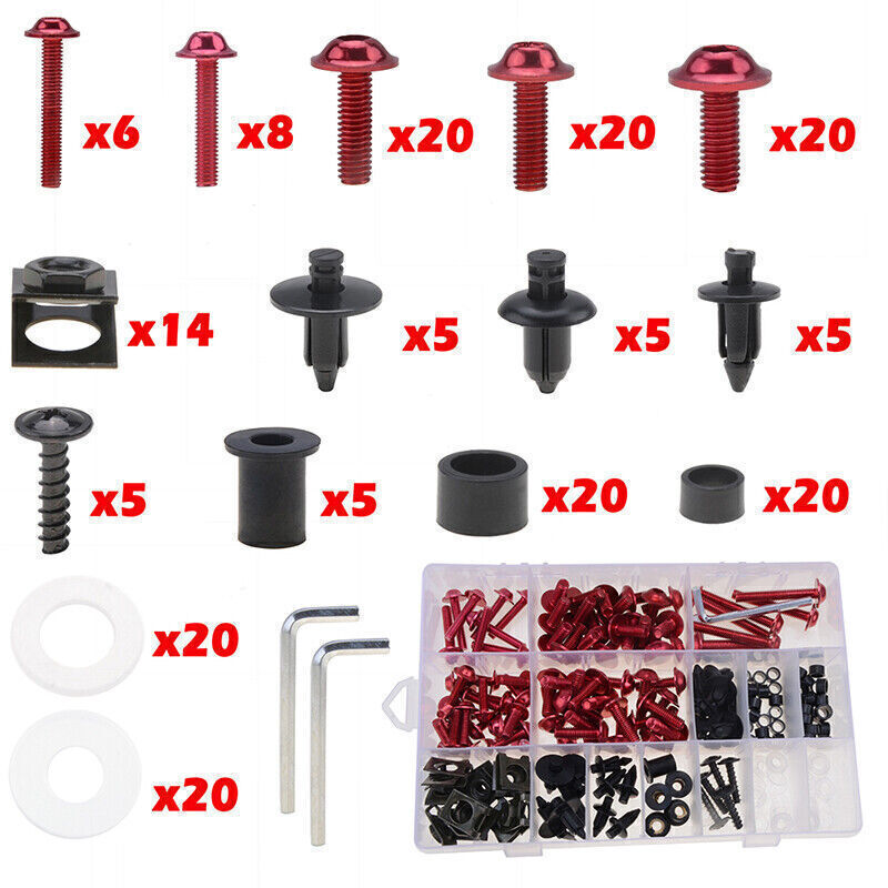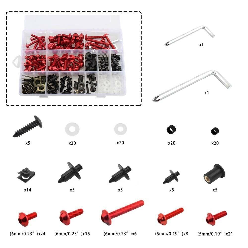 happy and satisfied. So you can buy with confidence. Package includes: (with Plastic Box) Color depends on your choice Total: 195PCS M6 Bolts (6 x 45mm) x 6 M6 Bolts (6 x 25mm) x 15 M6 Bolts (6 x 21mm) x 24 M5 Bolts (5 x 30mm) x 8 M5 Bolts (5 x 20mm) x 21 M6 Truss Screws x 5 Speed Clips x 14 M6 Washers x 20 M5 Washers x 20 M6 Plastic pillar x 20 M5 Plastic pillar x 20 Retainer Push Pins x 15 Well Nut x 5 Spanner x 2