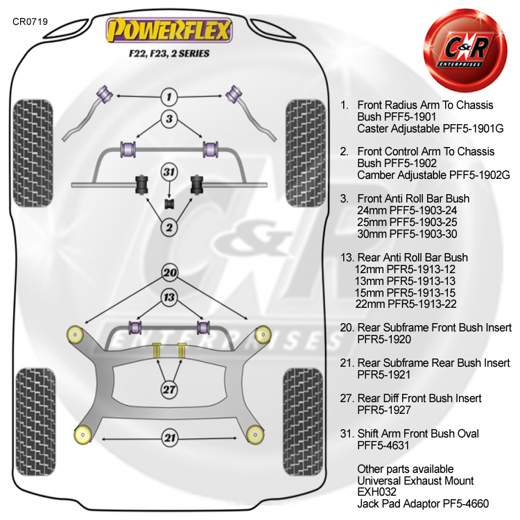 Um die richtige(n) Powerflex-Buchse(n) zu identifizieren, die Sie benötigen, sehen Sie sich bitte das Positionsdiagramm weiter unten in der Auflistung an.