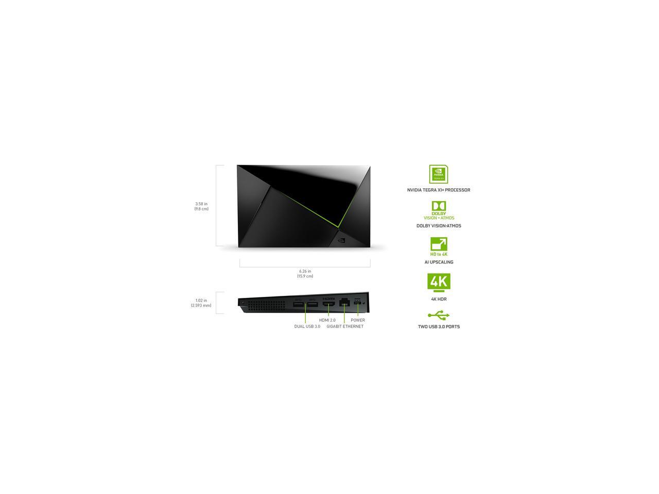 Learn more about NVIDIA SHIELD TV Pro (945-12897-2500-101) Model Brand NVIDIA Model SHIELD TV Pro (945-12897-2500-101) Details Type Digital Media Streamer Color Black Specifications Weight & Size:Weight: 8.80 oz. / 250 gHeight: 3.858 in / 9.800 cmWidth: 6.26 in / 15.900 cmDepth: 1.02 in / 2.593 cmStorage:16GB** Portion of storage occupied by system softwareExpandable using USB flash or hard drives. Wireless:802.11ac 2x2 MIMO 2.4 GHz and 5 GHz Wi-FiBluetooth 5.0 + LECaptive Portal support Software Updates:SHIELD Experience Upgrades directly from NVIDIAVoice Assistants:Built in Voice ControlThe Google AssistantHands-free Voice Control*Google Home compatible (Google Assistant)**Amazon Echo compatible (Works with Alexa)*** Requires SHIELD Controller or Google Home Mini or Amazon Echo.** Google ecosystem includes the Google Assistant, Google Play Movies and TV app, Google Music app, Google photos, and access to Google calendar. Amazon ecosystem includes Alexa voice assistant with Amazon Echo device linked to SHIELD, Prime Video app, and Amazon Music app. Power:40W power adapter (5-10W typical consumption)Gaming Features:NVIDIA GeForce NOW game streaming service (compatible game controller or keyboard/mouse is required)NVIDIA GameStream (requires compatible GeForce RTX or GTX-powered PC)Advanced Android gaming via Google Play Store Included Apps:NVIDIA GamesNetflixYouTubeAmazon Prime VideoGoogle Play Movies & TVVuduAmazon MusicGoogle Play StoreGoogle Play MusicPLEX Media ServerGoogle Play GamesNVIDIA Share (Game capture and broadcast) TV Remote Control SHIELD Remote- Microphone for voice search and commands- Motion-activated backlit buttons- Bluetooth connectivity- IR blaster for control of volume and power on TVs, soundbars, or receivers- Remote locator for finding a lost remote- 2x AAA batteries included Tuner Interface Gigabit EthernetHDMI 2.0b with HDCP 2.2 and CEC supportTwo USB 3.0 Ports (Type A) Video System 4K HDR ReadyDolby Vision HDR and HDR10 AI-enhanced upscaling for 720p/1080p to 4K up to 30 FPSUp to 4K HDR playback at 60 FPS (H.265/HEVC)Up to 4K playback at 60 FPS (VP8, VP9, H.264, MPEG1/2)Up to 1080p playback at 60 FPS (H.263, MJPEG, MPEG4, WMV9/VC1) Format/Container support: Xvid/ DivX/ASF/AVI/MKV/MOV/M2TS/MPEG-TS/MP4/WEB-M Audio Dolby Audio Support (Dolby Digital, Dolby Digital Plus, Dolby Atmos)DTS-X surround sound (pass-through) over HDMIHigh-resolution audio playback up to 24-bit/192 kHz over HDMI and USBHigh-resolution audio up-sample to 24-bit/192 kHz over USBAudio support: AAC, AAC+, eAAC+, MP3, WAVE, AMR, OGG Vorbis, FLAC, PCM, WMA, WMA-Pro, WMA-Lossless, DD+/DTS (pass-through), Dolby Atmos (pass-through), Dolby TrueHD (pass-through), DTS-X (pass-through), and DTS-HD (pass-through) System Processor NVIDIA Tegra X1+ Graphics Card 256-core GPU Memory 3GB RAM Operating Systems Supported Android 9.0 (Pie) powered by Android TV with Chromecast 4K built-in Features Features The Best of the Best The world's most powerful Android TV streaming media player, thanks to the new NVIDIA Tegra X1+ chip. Enhance HD video in real-time to 4K for clearer, crisper visuals using next-generation AI upscaling. 2x USB 3.0 ports for storage expansion, USB cameras, keyboards, controllers, and more. Plex Media Server built-in, 3GB RAM, and 16GB storage. Dolby Vision - Atmos Bring your home theater to life with Dolby Vision HDR, and surround sound with Dolby Atmos and Dolby Digital Plus - delivering ultra-vivid picture quality and immersive audio. Best-In-Class Design Designed for the most demanding users and beautifully designed to be the perfect centerpiece of your entertainment center, SHIELD TV Pro levels you up to more storage space, more RAM, the expandability of 2x USB 3.0 ports, and Plex Media Server. Get the best connectivity with Gigabit Ethernet, dual-band AC Wi-Fi, and Bluetooth 5.0. The all-new remote is more advanced than ever with motion-activated, backlit buttons - including a customizable menu button. Plus, with voice control, Bluetooth, IR control for your TV, and a built-in remote control locator, you have the most advanced remote yet. Unlimited Entertainment Enjoy the most 4K HDR content of any streaming media player, and access to thousands of apps and games, including top apps like Netflix,YouTube, Prime Video, Disney + and Hulu. Add a game controller (sold separately) and play today's most popular games like Fortnite and GeForce Now. Even stream from your phone with built-in Chromecast 4K. Voice Control The built-in Google Assistant is at your command. See photos, live camera feeds, weather, sports scores, and more on the big screen. Dim the lights and immerse yourself in your favorite show or music using only your voice. And control your SHIELD hands-free with Google Home or Alexa and Amazon Echo. Package Contents Package Contents SHIELD TV stand sold separately