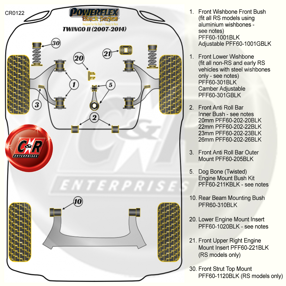 Um die richtige(n) Powerflex-Buchse(n) zu identifizieren, die Sie benötigen, sehen Sie sich bitte das Positionsdiagramm weiter unten in der Auflistung an.