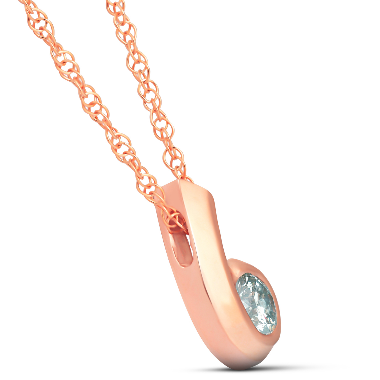 This unique women's bezel pendant features one .25ct round brilliant cut natural diamond. The diamond is set in solid 14k rose gold. An 18" 14k rose gold chain is included. .25ct total diamond weight.