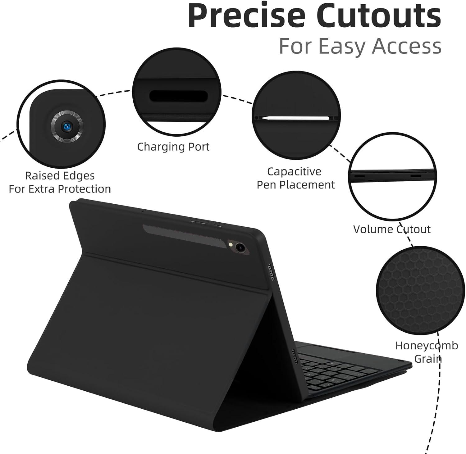 - 7-Color Backlight, Multi-Function Keyboard: Suitable for Samsung Tablet RGB backlight keyboard, 7 adjustable backlight colors, breathing light backlight mode can be automatically switched. The backlit keyboard can be used in the dark, providing a comfortable typing experience. Rich function shortcut keys allow you to use Samsung Tablet more efficiently and comfortably, such as editing documents, navigating applications, and creating presentations