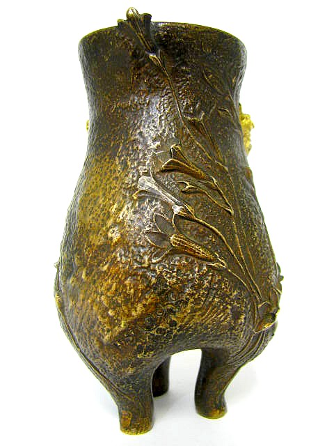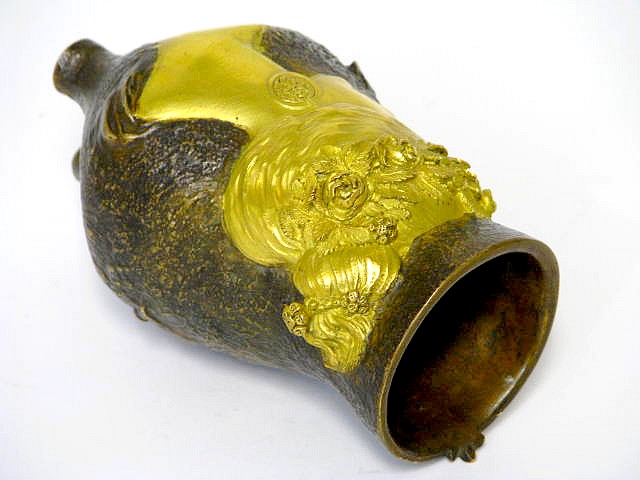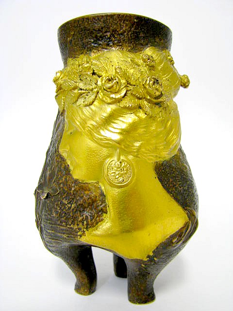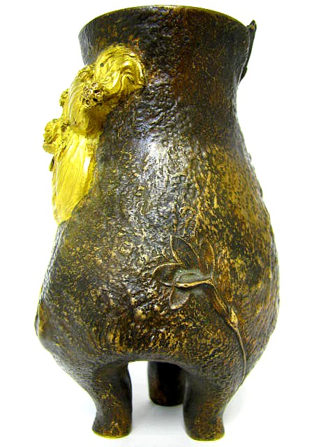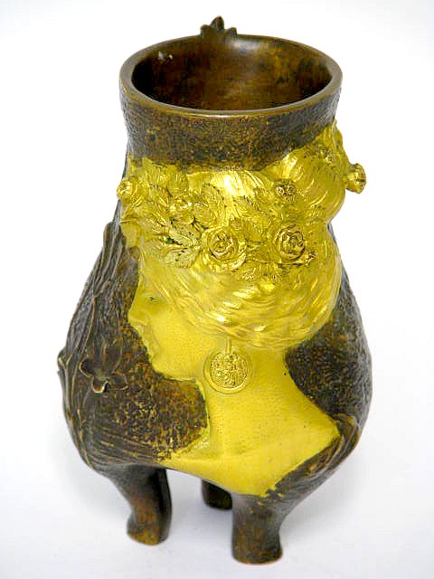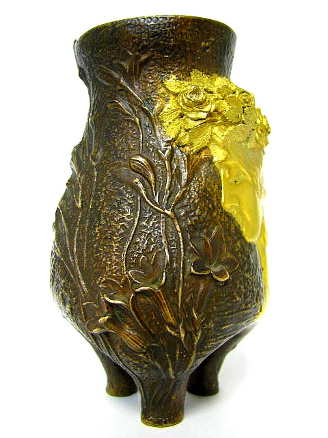 Auf 3 Füßen stehende, leicht patinierte, partiell vergoldete Bronze Vase mit Blütenstängeln auf der gerauhten Wandung sowie mit apartem Reliefbildnis einer Frau, die Rosen im Haar trägt.