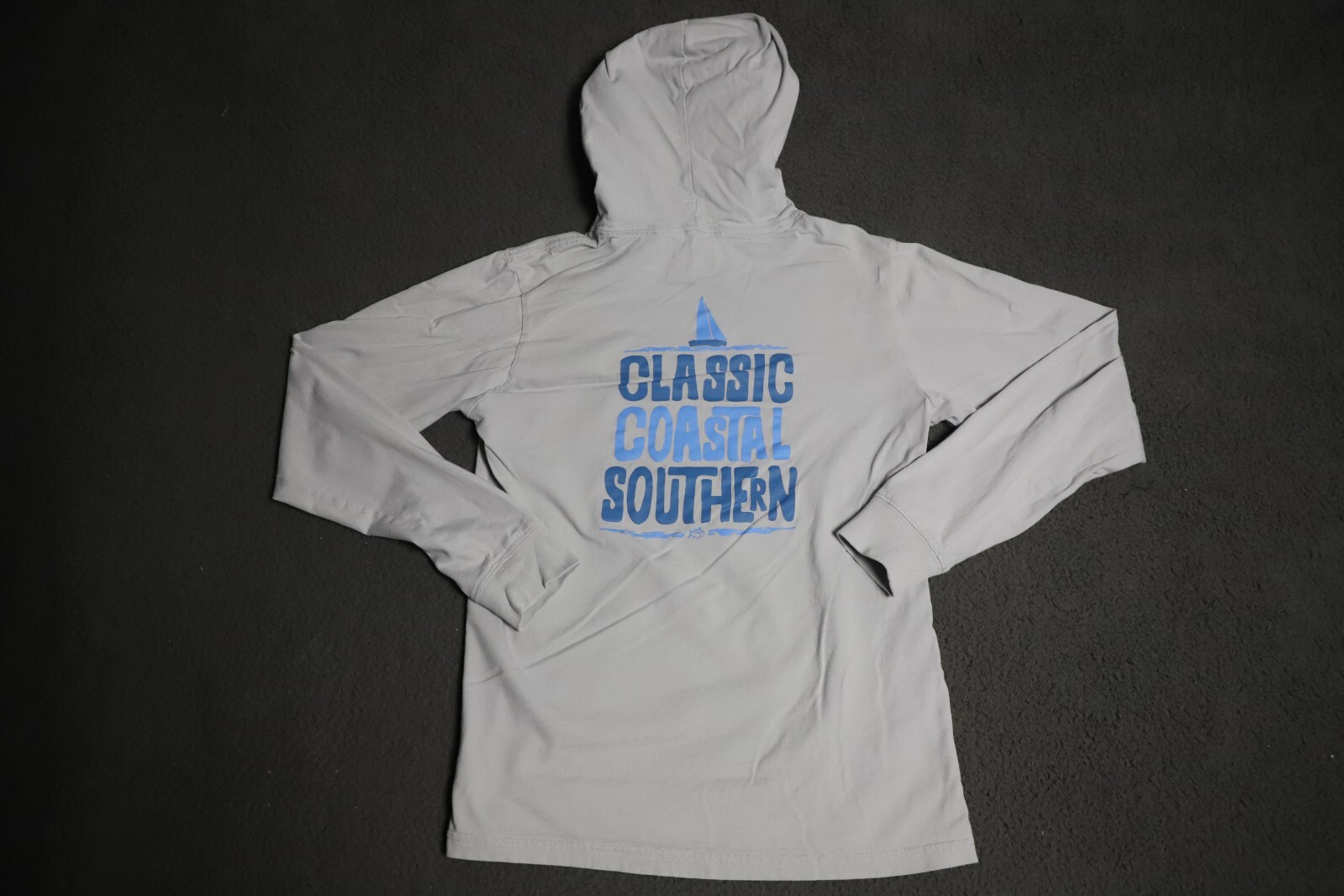 - Pre-Owned Southern Tide Pullover Hoodie Boys XL Gray Knit Classic Coastal Southern Graphic that may exhibit minor flaws or stains.