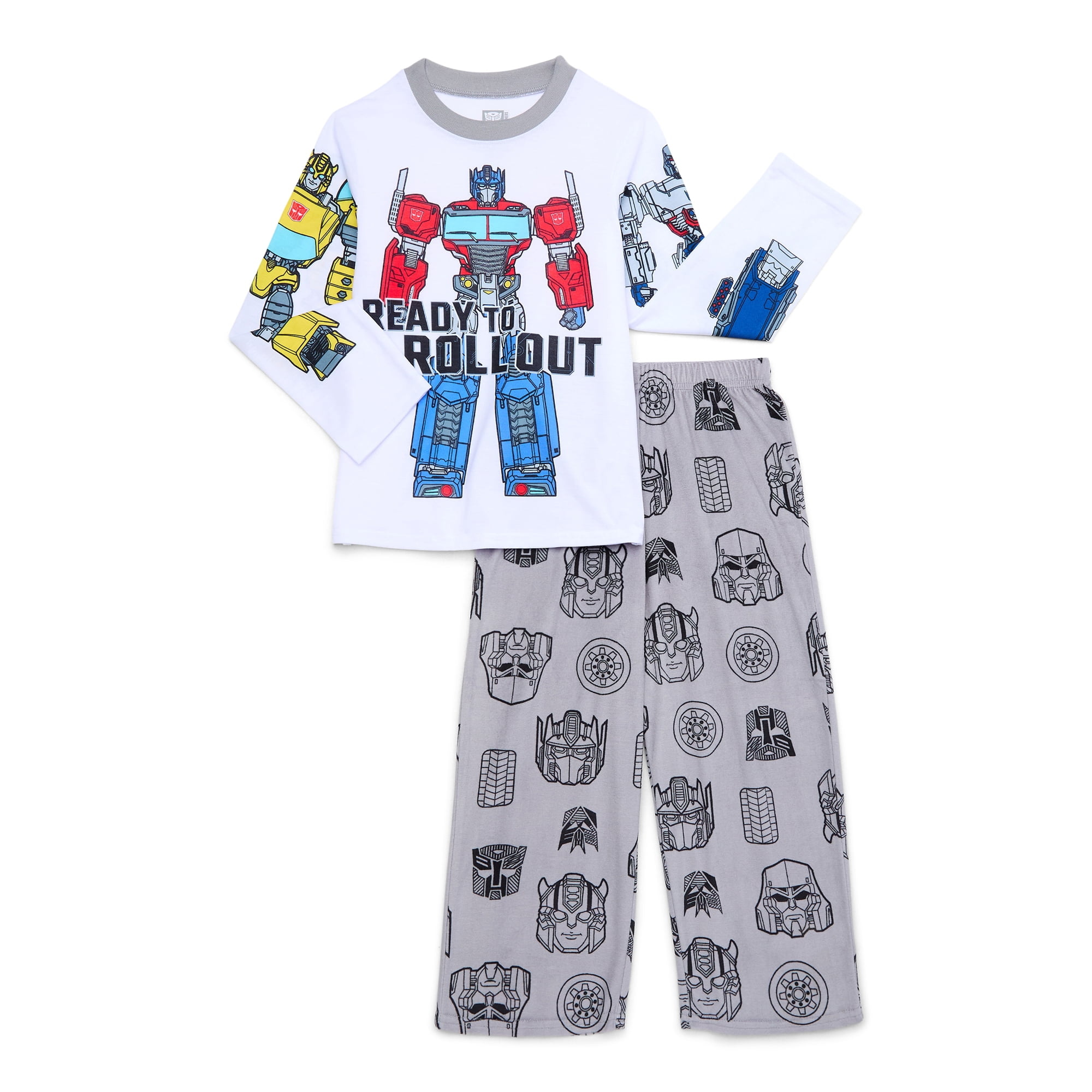 He'll be Ready to roll out to bedtime in this 2-piece pajama set from Transformers! The long-sleeved pajama top features a crew neckline and a large Transformers graphic print on the front and on the sleeves. The pajama pants feature an all-over Transformers iconic motif print against a gray background. The top is made of a soft polyester jersey and the pants are made of cozy, ultra-soft polyester fleece. This 2-piece pajama set is machine washable for easy care and flame resistant.