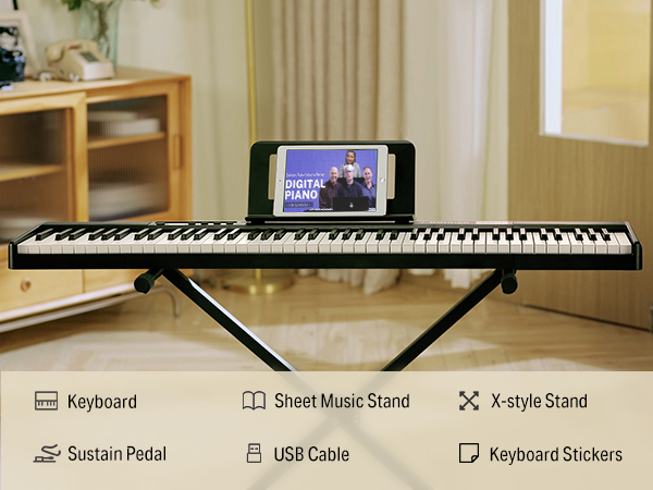 Charging & Plugging: Equipped with a high-capacity lithium battery, the 88 key digital keyboard provides an extended playtime up to 10 hours, allowing your creativity to flow freely. With a versatile dual-use power setup, you can charge it anywhere, portable and ready to use wherever you go.