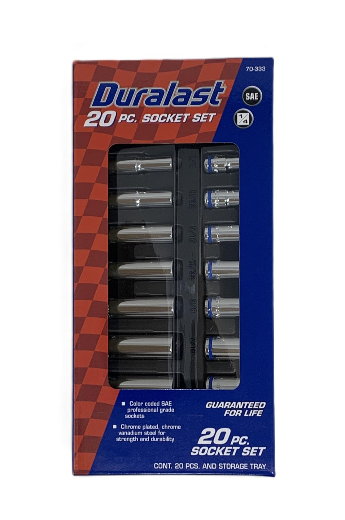 The Duralast 20PC Socket Set and Storage Tray (70-333) is a comprehensive tool kit designed for precision and durability. This set includes 20 pieces of high-quality sockets, specifically crafted for a 1/4" drive and made in the SAE (Society of Automotive Engineers) measurement standard. Each socket is 6-point, ensuring a secure grip and reducing the risk of rounding fasteners during use.