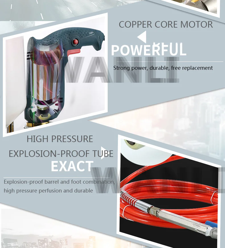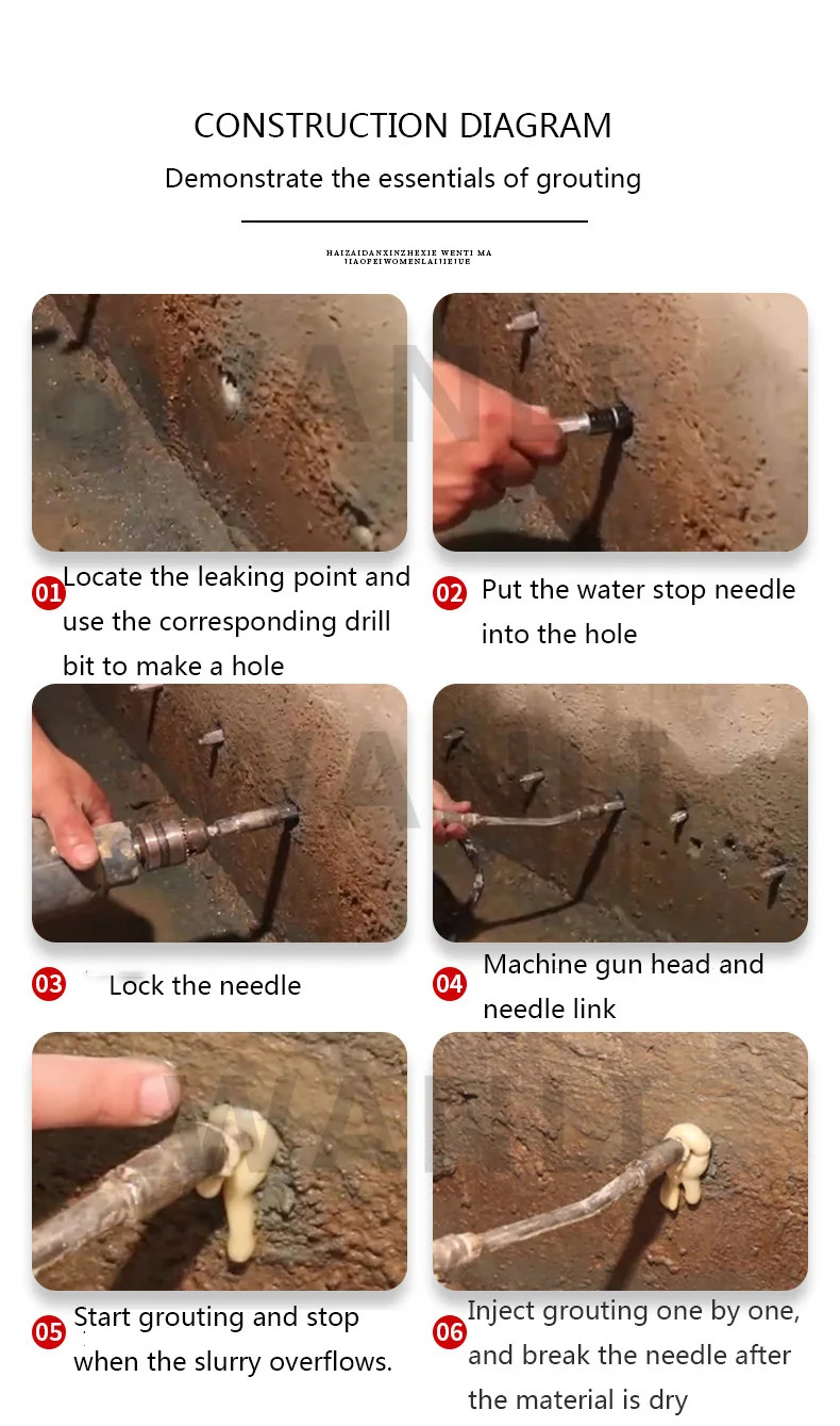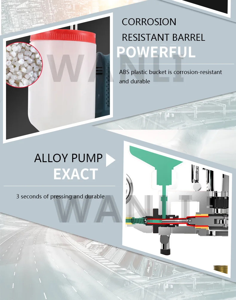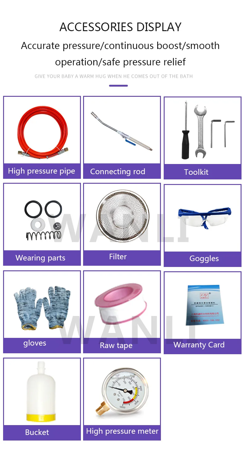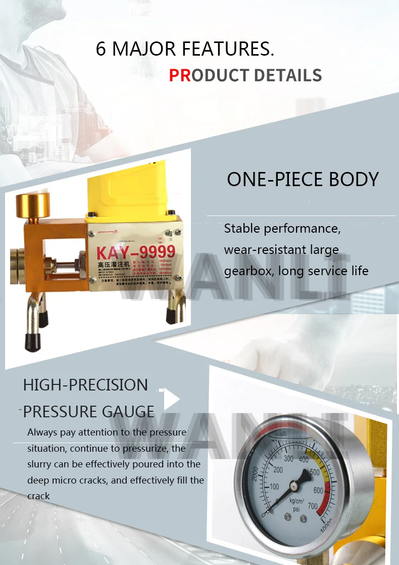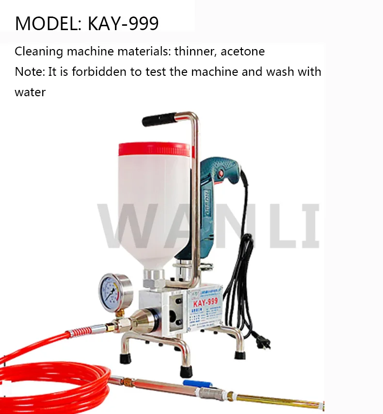 Product parameter product code Name: High Pressure Waterproof Grouting Machine Model: KAY-999 Package weight: 7KG Packing size: 33*21*47 Power: 910W Maximum pressure: 15000PSI Trial material: test machine with oil Cleaning machine materials: thinner, acetone Note: It is forbidden to test the machine and wash with water