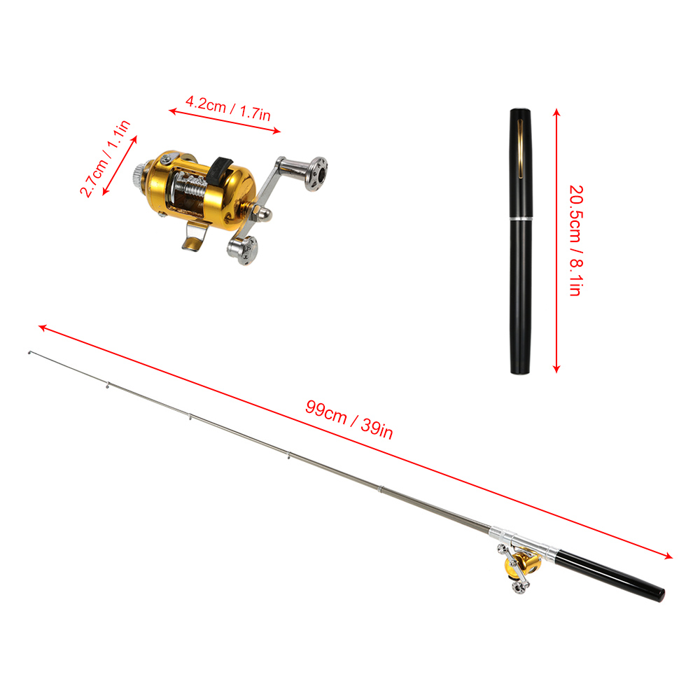 Pen-sized fishing rod is extendable, perfect for situations where full-size fishing gear is inconvenient. Closed length: 20.5cm(8.1"). Extended length: 99cm(39").