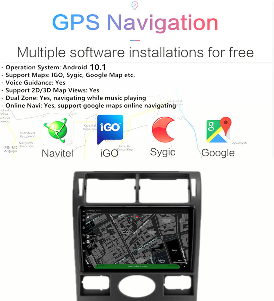 - Operation System: Android 10.1 - Support Maps: IGO, Sygic, Google Map etc. - Voice Guidance: Yes - Support 2D/3D Map Views: Yes - Dual Zone: Yes, navigating while music playing - Online Navi: Yes, support google maps online navigating |