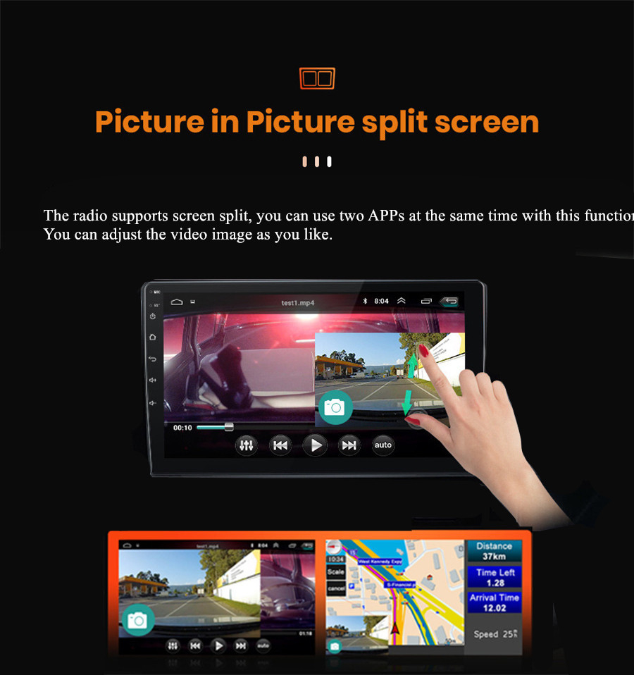 - Touch Screen: Yes - Resolution: 1024*600 - Capacitive or Resistance Screen: Capacitive - Built-in Clock and Calendar: Yes, show real time and can use network-provided time - Main Menu Status Bar display: Can be changed to Music/Radio/BT-Stereo Player and Clock/Date/Week - Change Apps-Icon Position: Yes - Picture in picture split screen:Yes |