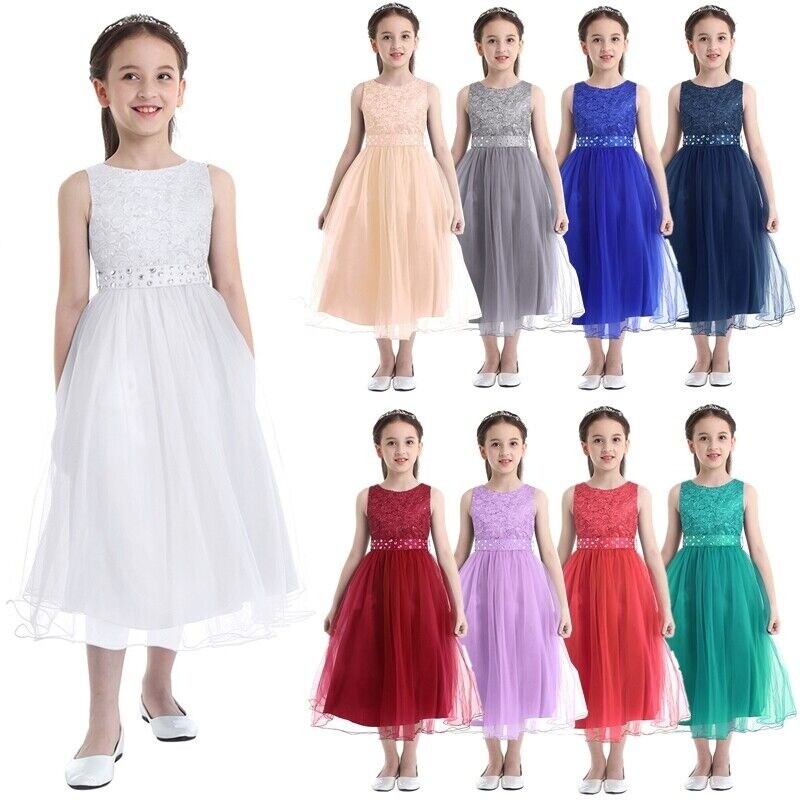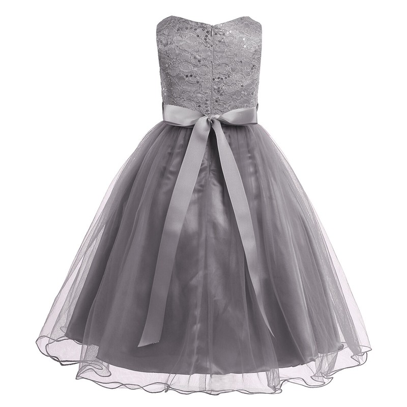 Sleeveless, sequined lace top bodice, hidden back zipper closure, comes with matching detachable rhinestones sash.