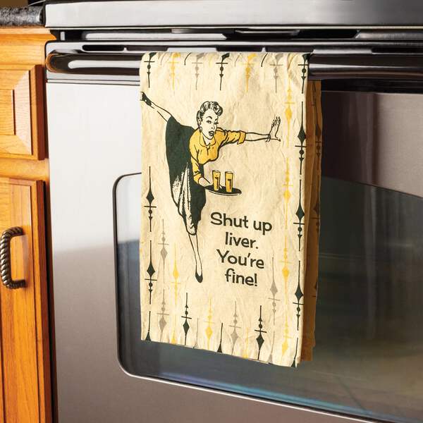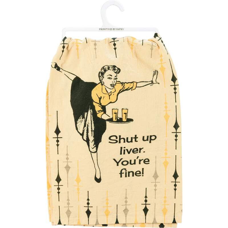 A cotton kitchen towel featuringĀ a retro-inspired pattern and depiction of a woman carrying drinking glasses. Includes "Shut Up Liver. You're Fine!" sentiment. Our Shut Up Liver You're Fine kitchen towel is machine-washable.