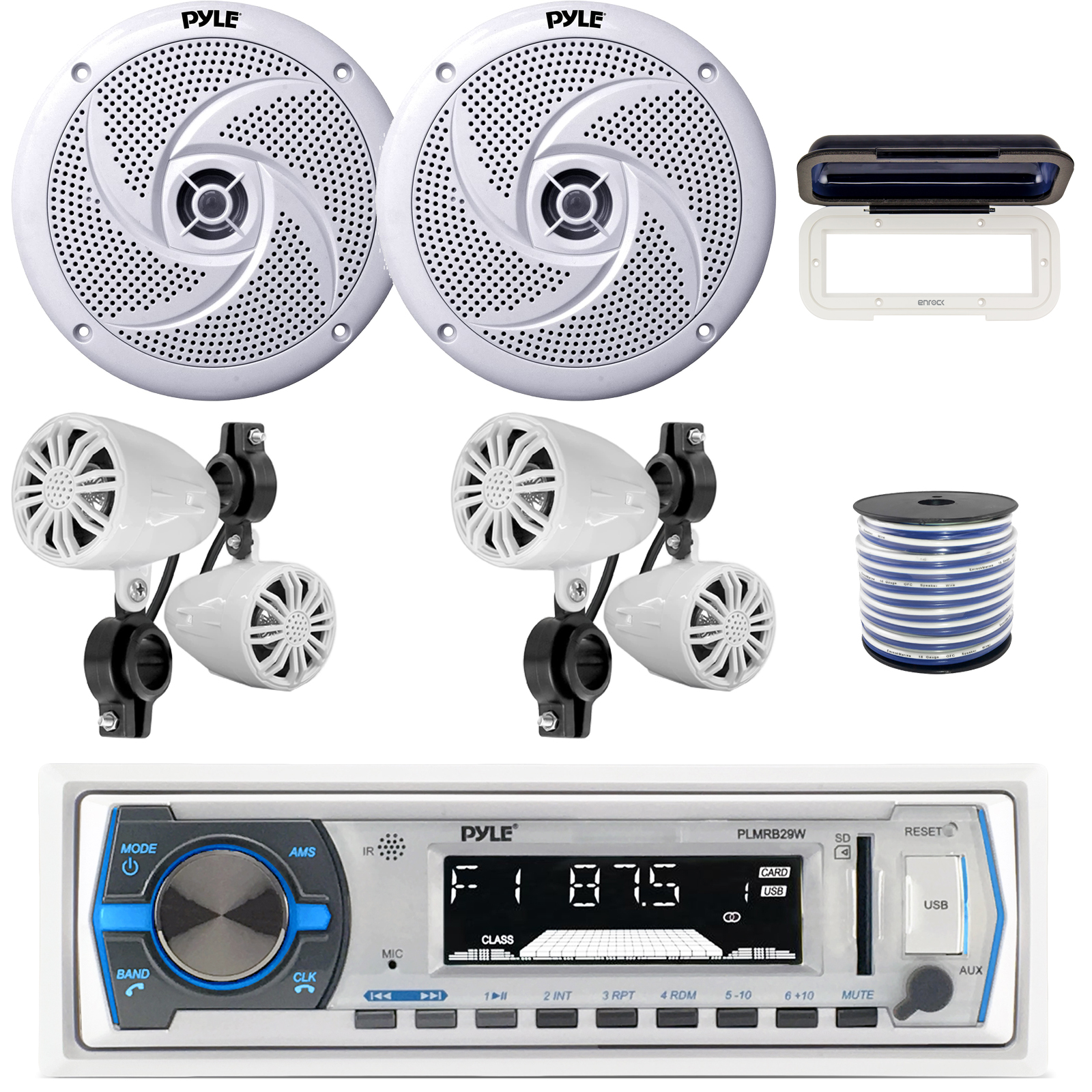 Pyle PLMRB29W Single DIN Bluetooth Marine MP3 In-Dash Stereo White Receiver W/White Cover, 2x 2.25’’ 10W Waterproof Rated Off-Road White Speakers, 2x 8'' 320W 2-Way Boat White Speakers, Speaker Wire