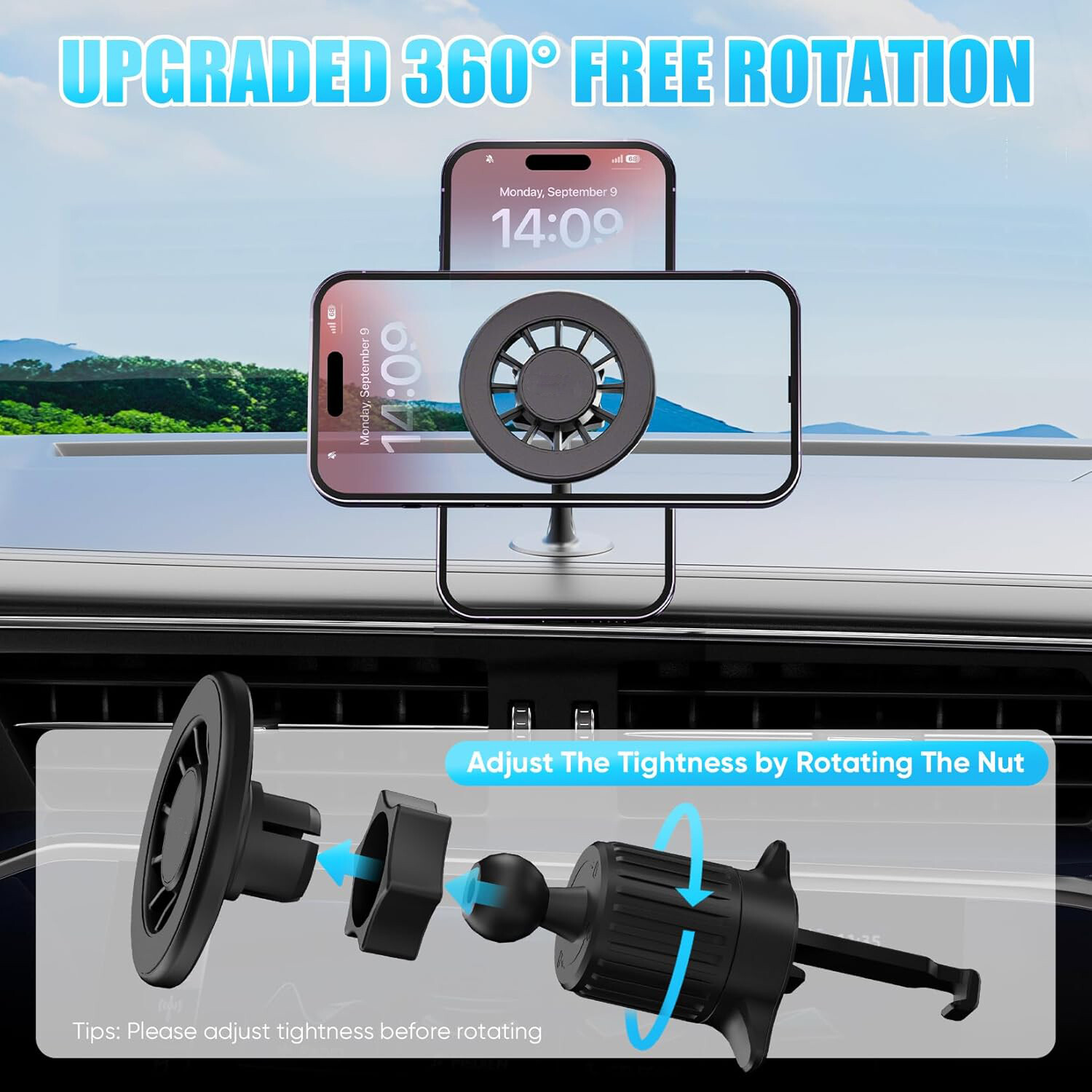 - [Upgraded 360° Free Rotation] - Compared with the traditional 360° free rotation design, we have added an adjustable nut to the adjustable rotating ball head. You can adjust the tightness of the rotation by rotating the nut. When you adjust the car phone mount to the most suitable position, you can tighten the nut to fix the position