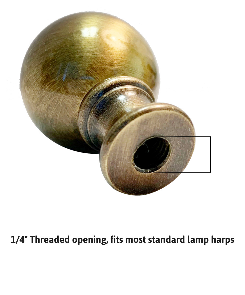A new lamp finial is the perfect way to complete your new or favorite lamp. Quality finial that is sure to dress up your tired lamp. Finials have a standard 1/4"-27 thread, which will fit the harp on almost every lamp. (This means the opening is 1/4" wide and there are 27 threads per inch.) 95% of all lamp harps will fit this finial. Material: Antiqued Brass finish with Antiqued Brass Base. Finial measures 1.75" height x 1" width.