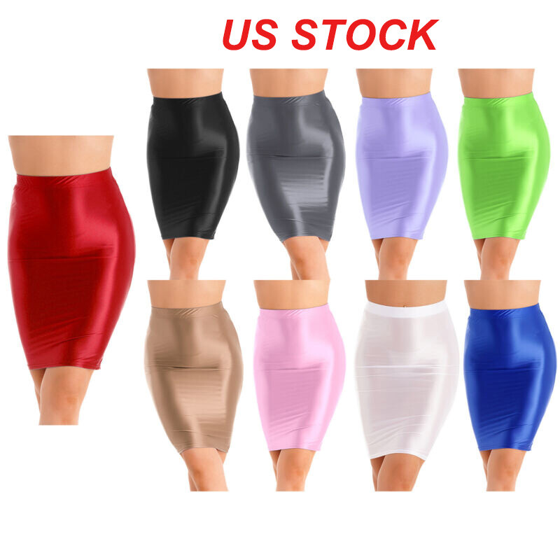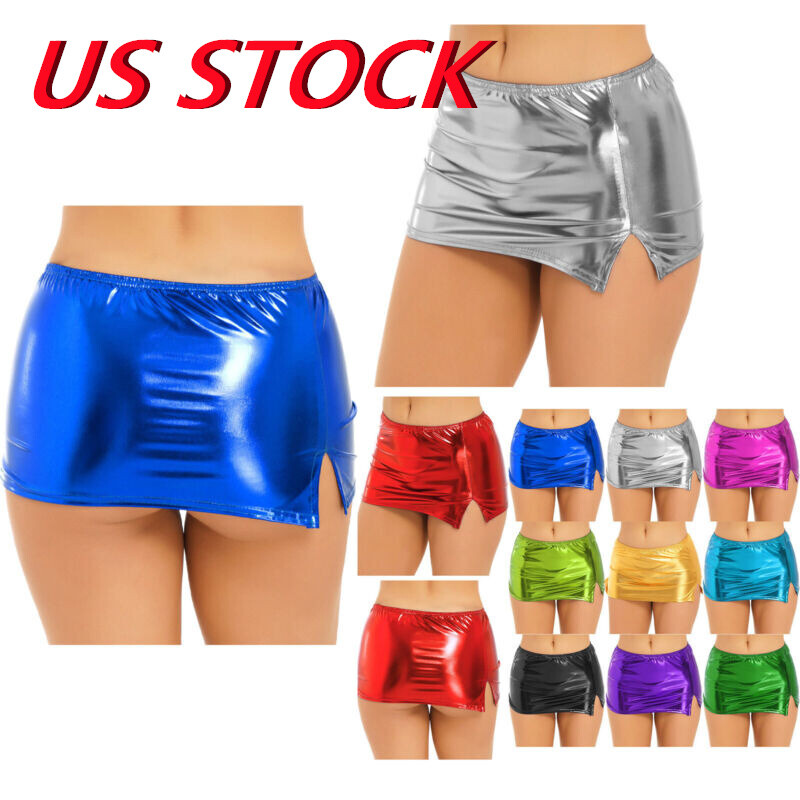 Women Glossy High Waist Flare Skirt Club Stage Costume Party Dancewear Shiny Metallic Ruffle Skirts.