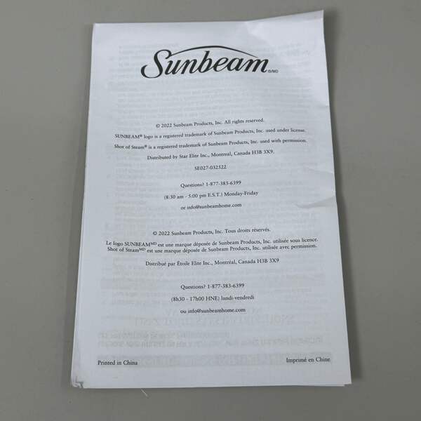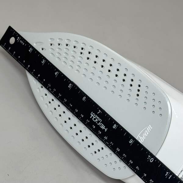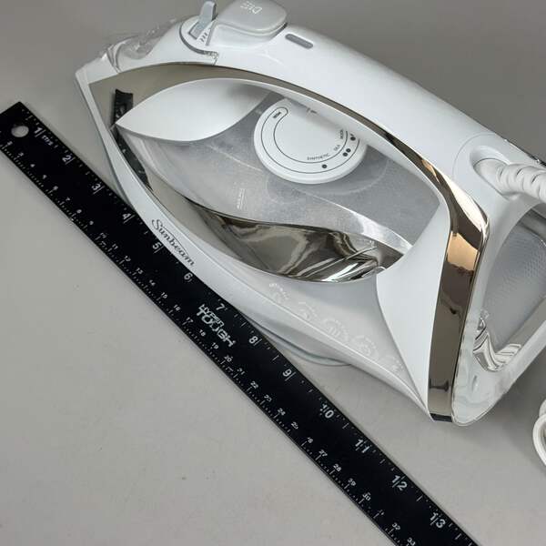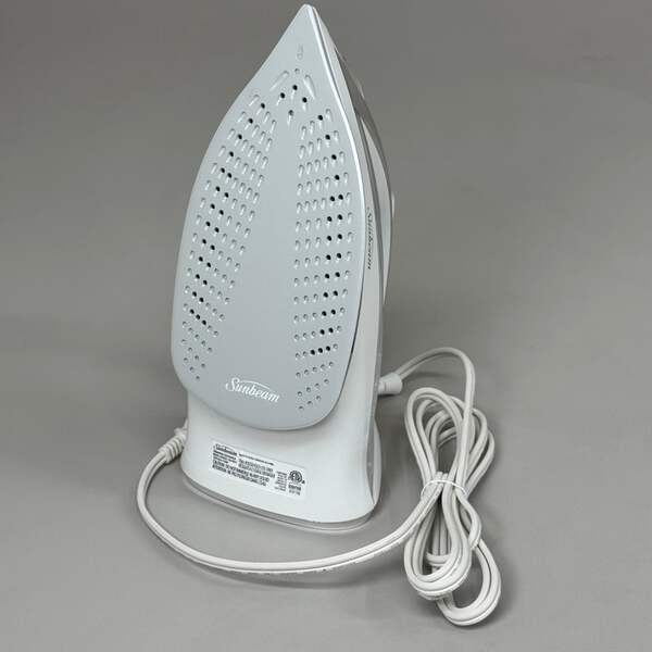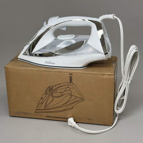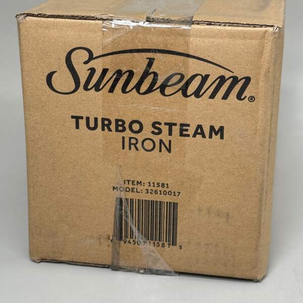 SUNBEAM Turbo Steam Iron w/ Steam Feature Large Tank Capacity Condition: New Size: Large Capacity 9.3"L x 3.7"W / 3-Way Auto / 1700W Color: Silver/White Model: 11581 Description: Equipped with 1700 Watts of power for quicker heating. Works horizontally or vertically for hanging garments, upholstery or drapery. Spray mist feature helps smooth out even the toughest wrinkles. Large ceramic coated nonstick soleplate glides smoothly across fabrics. Equipped with a 3-way motion smart auto-off feature for added safety and peace of mind.