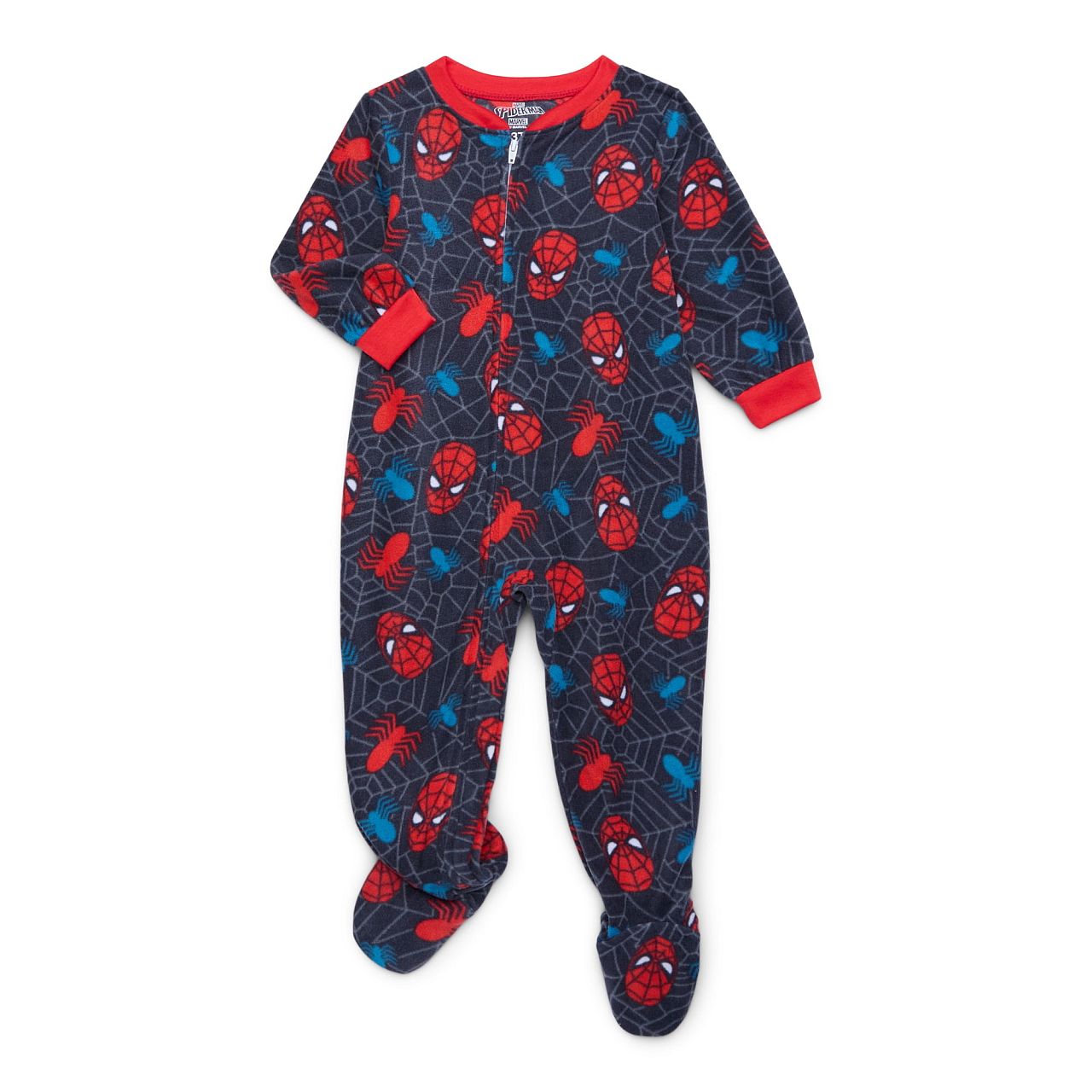 This Spider-Man sleeper is designed to be a hit, thanks to its fun and engaging all-over Spidey-themed print set against a cozy black background. Made from ultra-soft fleece polyester, it ensures maximum comfort for at bedtime. The vibrant red rib-knit collar and cuff trim add a stylish touch, while the full front zipper offers easy on-and-off access. Additionally, the non-slip, textured foot soles provide safety and stability for active play. This garment is made of 100% polyester, making it durable and easy to care for. Perfect for any young superhero fan!