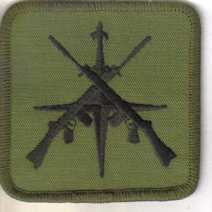 This item is a SINGLE of cloth rounded corner, square SHAPED patch showing a pair black Crossed (SLR ) Rifles superimposed on a black NATO 'star' on an olive background - earlier NON-plastic backed