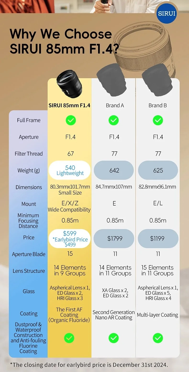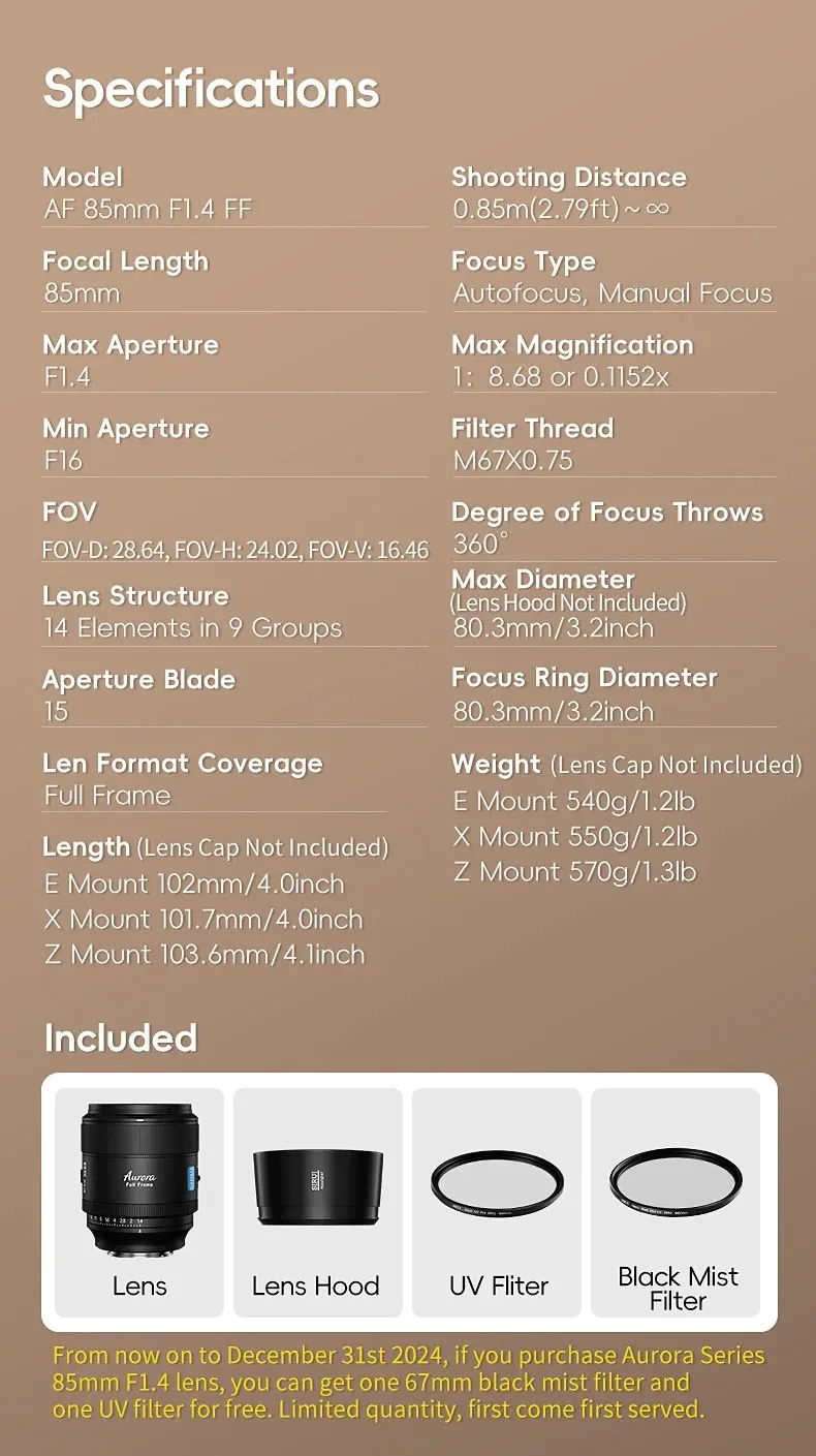 Hign-concerned Chemical : none Applicable Camera Specifications : APS-C Mirrorless Camera,Full Frame Mirrorless Camera Focal Length : 85mm Launch Date : 2024 Package : Yes Weight : 501g-600g Maximum Aperture : f/1.4 Lens UV Filter Size : 67mm Number of Diaphragm Blades : 14 Blades Focus Mode : Af, Mf Focus Type : COSCO Camera Lens Type : Fixed Focus Lens Full Frame : Yes Lens Type : Automatic Scene Type : Wedding,Business,CINE,HUMAN,Architecture,Scenery,Still Life,Travel,People,Night Scene,ORIGINALITY Brand Name : VILTROX Origin : Mainland China Certification : CE Use : Camera