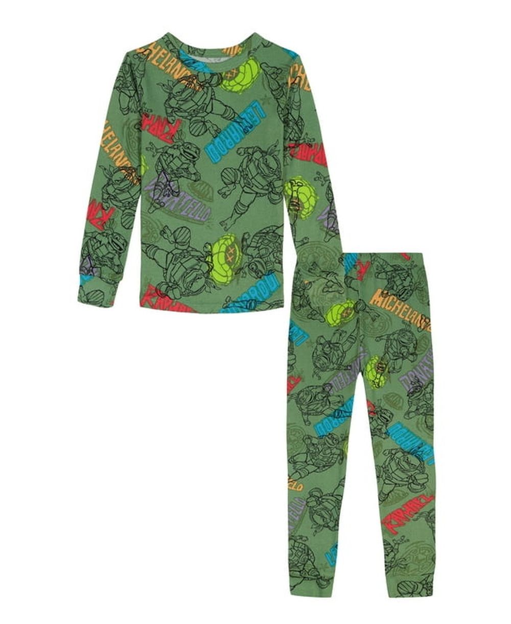 Cowabunga! This Two-Piece Pajama Set is inspired by your child's favorite heroes-Teenage Mutant Ninja Turtles! It features a vivid print of Michelangelo, Donatello, Leonardo, and Raphael against a green background. It's crafted of a super soft polyester fabric with 5% spandex for a great stretch, ensuring he's comfy while sleeping or on superhero adventures with his Ninja buddies. Turtle power!