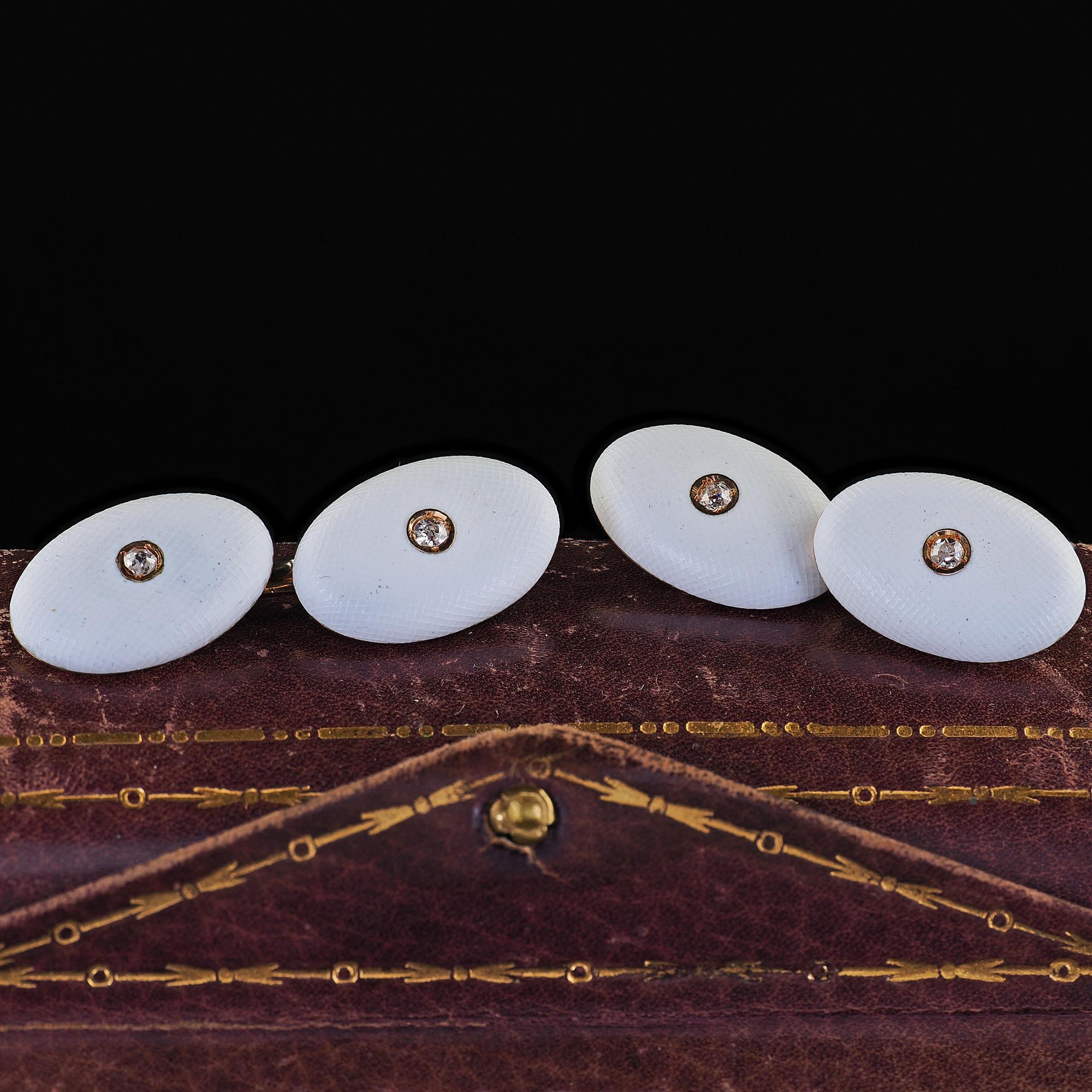 Beautiful Antique Art Deco 14K Yellow Gold Old Mine Diamond and Enamel Cufflinks. These incredible Art Deco diamond and enamel cufflinks are crafted in 14k yellow gold. These beautiful cufflinks feature white enamel on top of the cufflinks that are matted and have a single old cut diamond in the center. The cufflinks are in great condition and absolutely gorgeous!