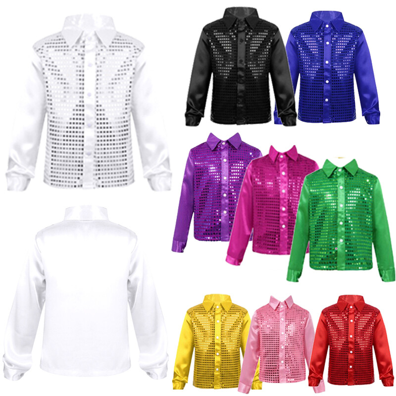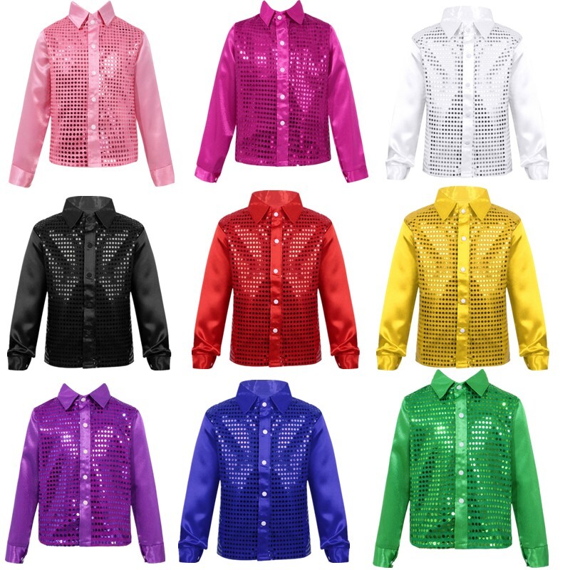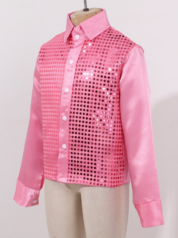 Long sleeves, turn-down lapel collar, front decorated with shiny sequins.