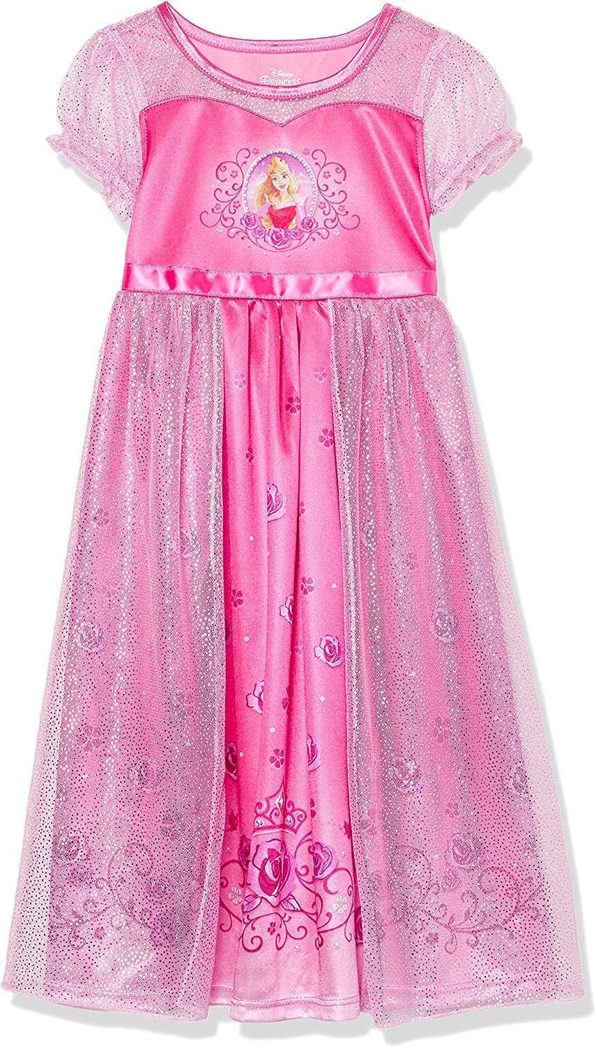 She'll be as elegant and royal as one of her favorite Princesses Aurora in this deluxe nightgown. Features a sweet and colorful cameo graphic of Sleeping Beauty surrounded by a floral and scroll design. A pink satin stretch collar and elasticized tulle short sleeves. A coordinating overlay and skirt section adorned by pink roses throughout. Polyester