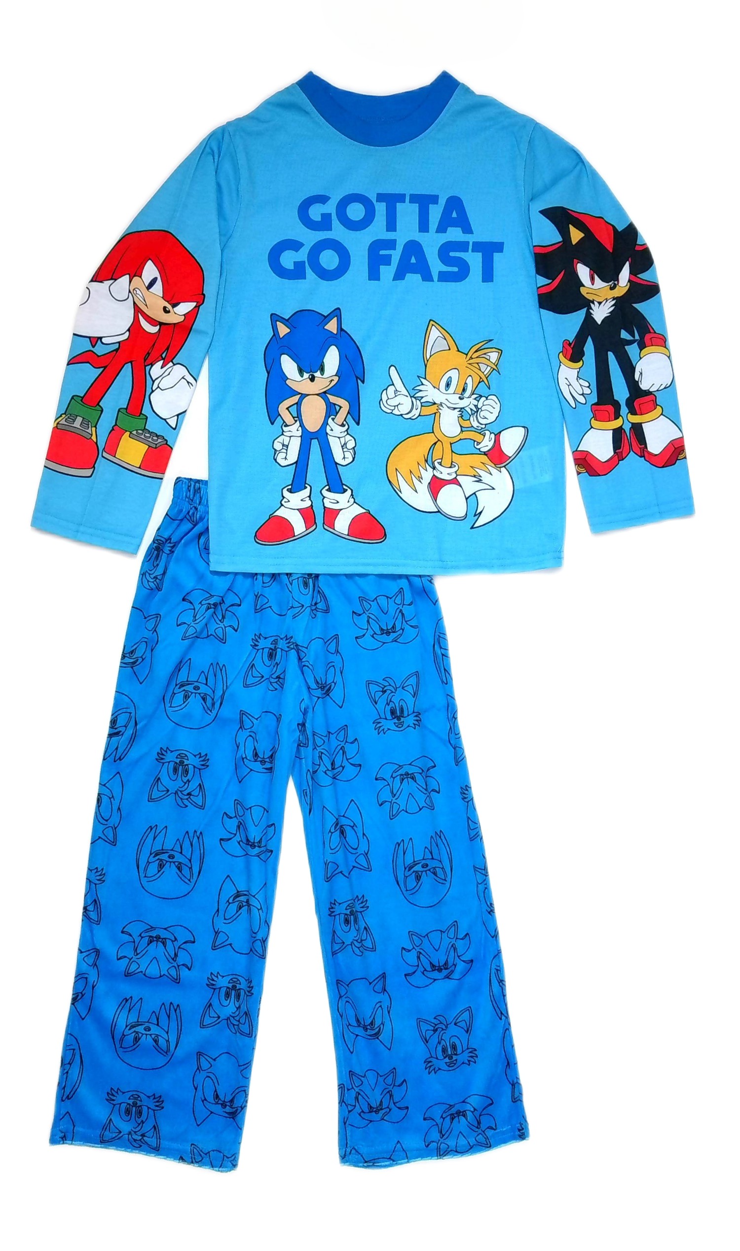 He can get ready for bedtime with this fun and comfortable 2-piece pajama set featuring Sonic the Hedgehog! The top features an exciting design with beloved characters like Sonic, Tails, Knuckles, and Vegeta on the front and down the long sleeves, making it perfect for fans.