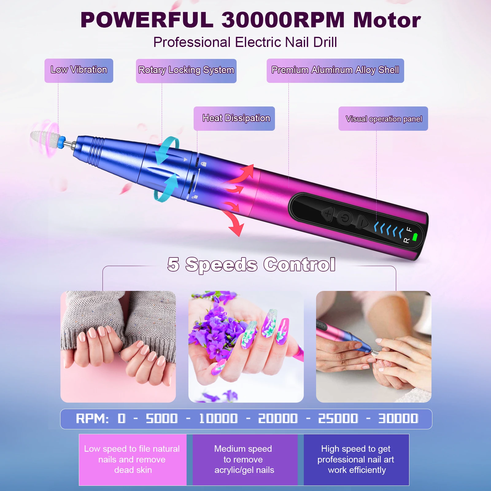 Upgrade Motor: Five optional speed set (Max 35000 RPM) for nail artwork with low heat, low noise, stronger operability, and controllability. Do your nail smoothly and enjoy the feeling of low vibration.